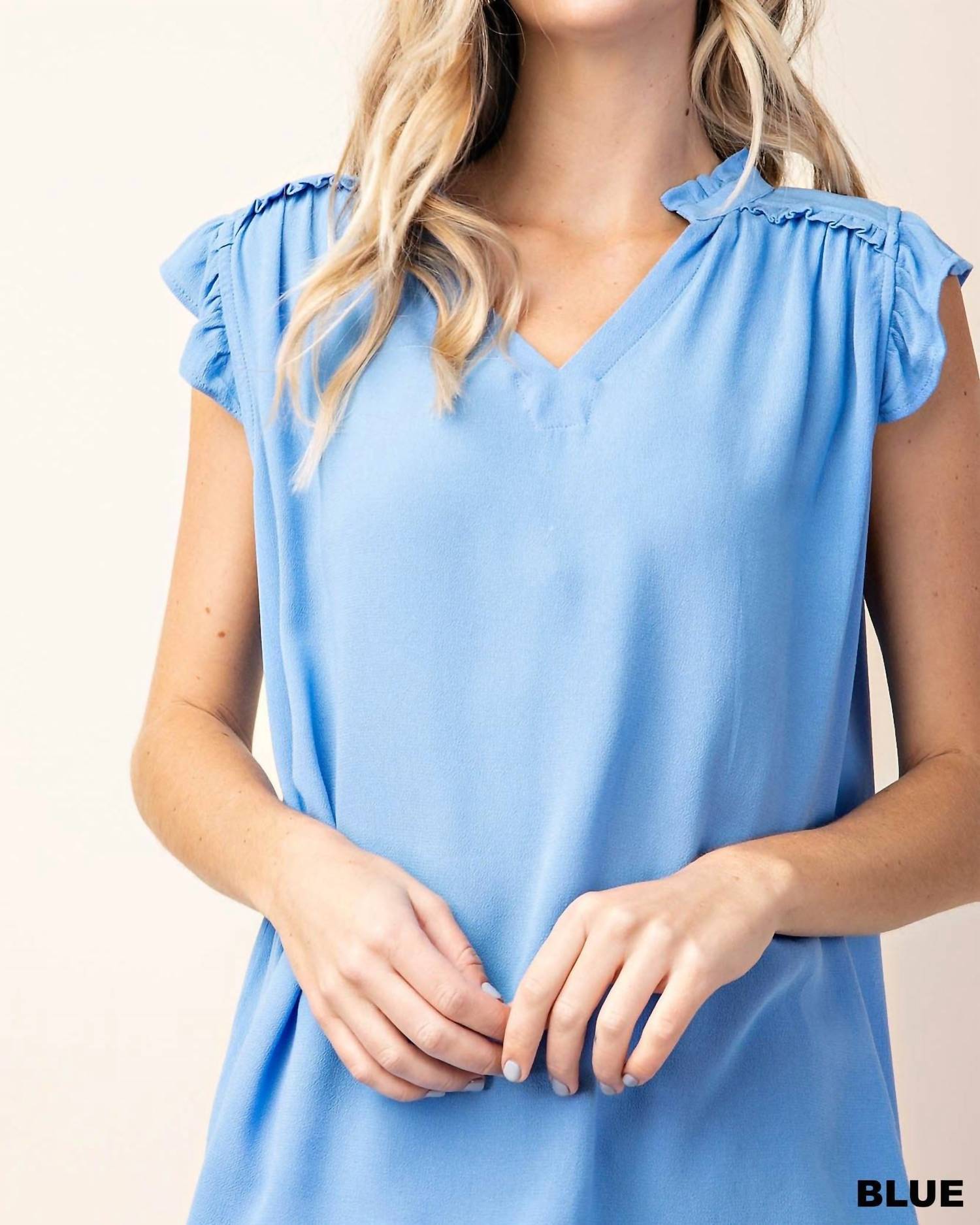Блузка, которая никогда не выйдет из моды. Представляем блузку KORI с рукавами-воланами в нежном голубом оттенке, созданную для современной женщины. Эта однотонная блузка с V-образным вырезом имеет изящные короткие рукава, идеально подчеркнутые мягкими оборками. Изготовленная из 100% вискозы, эта блузка отличается роскошным качеством, а застежка-молния обеспечивает удобство ношения. Идеальная для любого гардероба, эта вещь легко сочетает в себе комфорт и стиль.