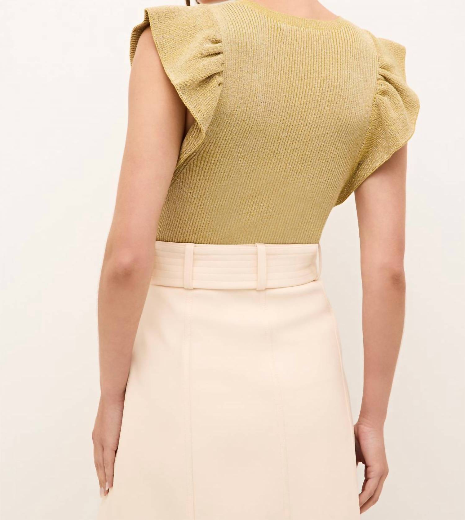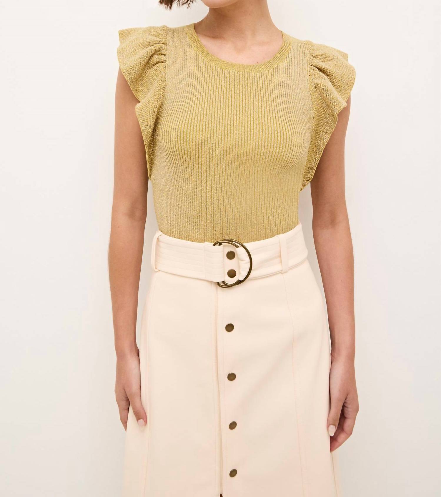 Блузка, которая никогда не выйдет из моды. Представляем блузку Rory от Marie Oliver - сверкающее дополнение к вашему гардеробу в золотистом цвете. Эта блузка без рукавов имеет фактурный ребристый лиф и очаровательные рукава с оборками, которые подчеркивают ее сдержанную элегантность. Изготовленная из 82% вискозы и 18% полиэстера, эта блузка без застежек имеет облегающий крой, подчеркивающий фигуру. Инструкция по уходу: химчистка или ручная стирка с мягким моющим средством, сушить в разложенном виде.