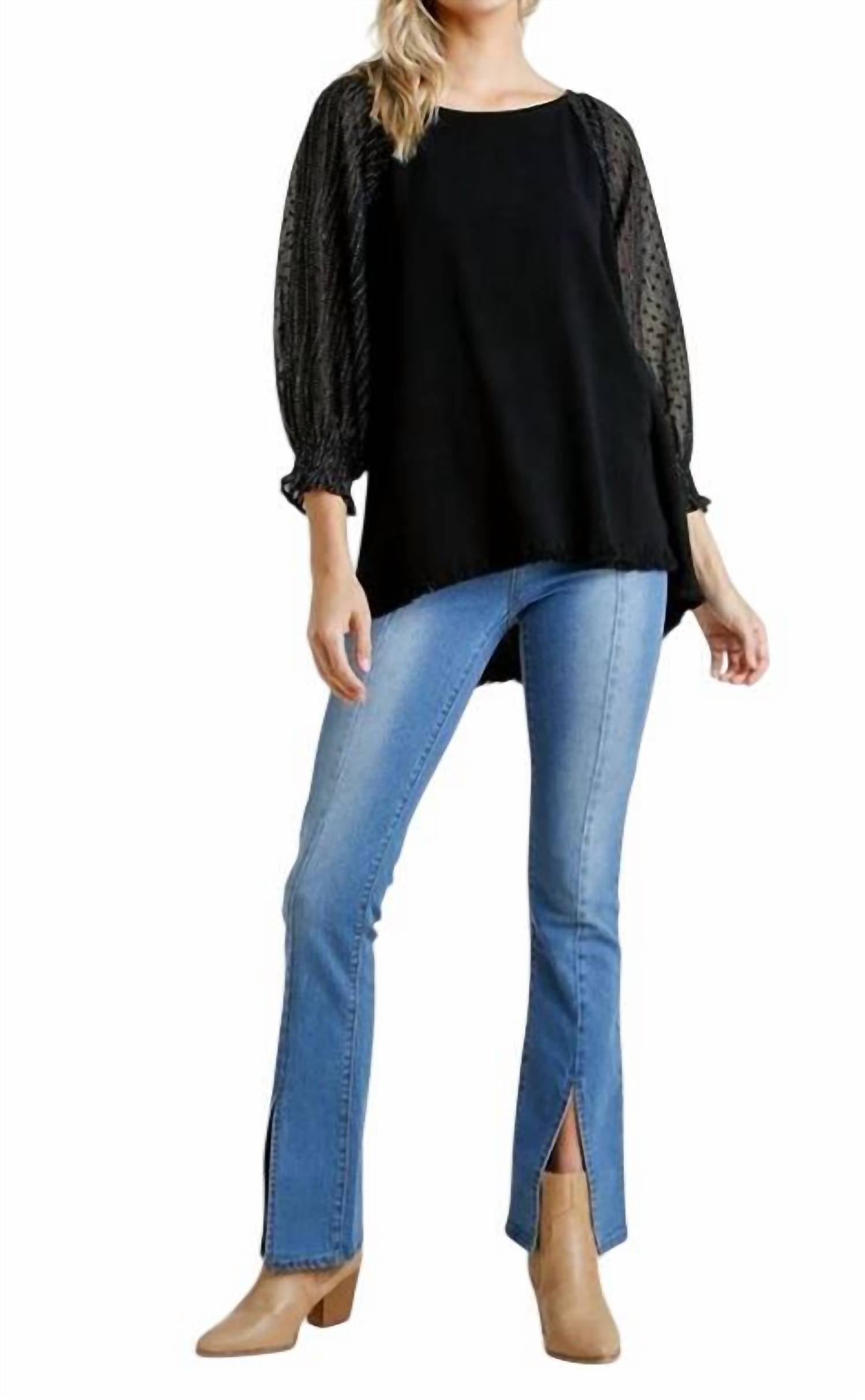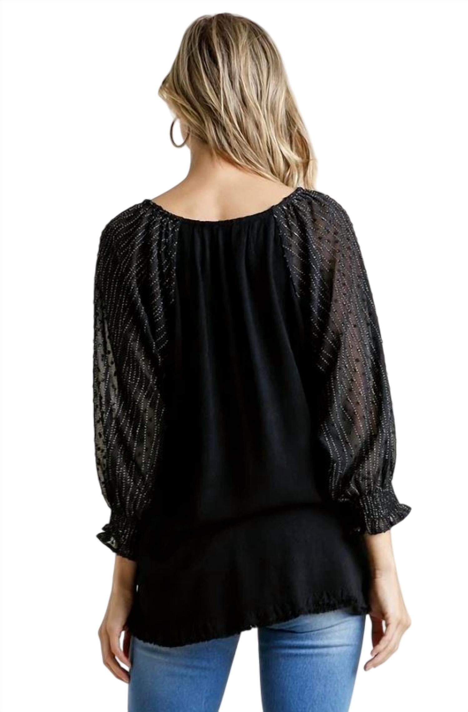 Откройте для себя топ Umgee Mesh Puff Sleeve Top - стильное и модное дополнение к любому гардеробу. Этот черный топ с длинными рукавами-фонариками из сетчатой ткани в горошек имеет круглый вырез и асимметричный подол с бахромой, создающий свободный А-образный силуэт. Изготовлен из легкой смеси 55% льна и 45% хлопка, импортирован и легко сочетается с другой одеждой благодаря застежке-молнии. Уход за этим фактурным изделием: ручная стирка в холодной воде.