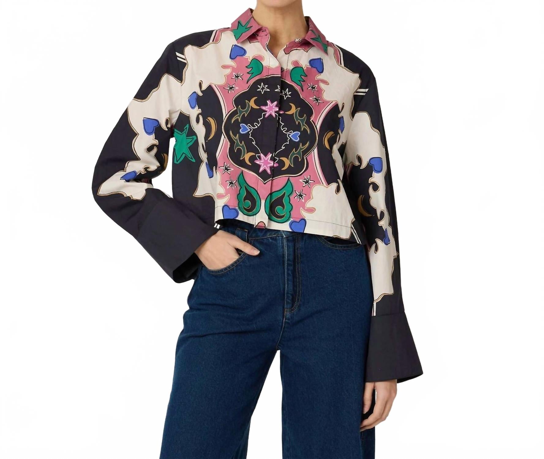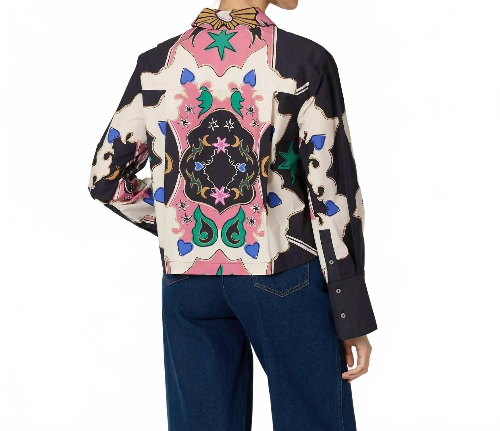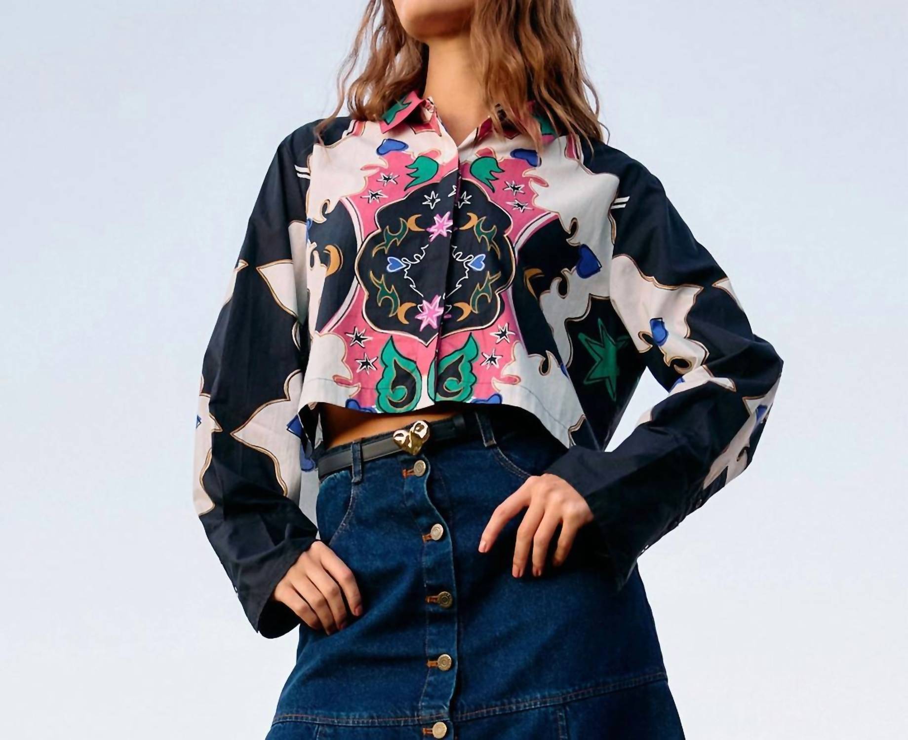 Классическая рубашка на пуговицах, которая никогда не выйдет из моды. Откройте для себя непринужденную элегантность блузки Zoya от Cleobella, изготовленной вручную в Индии с соблюдением этических норм. Эта блузка с длинными рукавами и пуговицами, изготовленная из 100% органического хлопка, сертифицированного GOTS, имеет элегантный воротник и удлиненные манжеты, а также изысканный узорчатый принт цвета Estelar. Благодаря укороченной длине и удобному дизайну, она идеально подойдет для праздничной вечеринки. Уход: ручная стирка в холодной воде, сушить в расправленном виде или химчистка. Ана ростом 176,5 см и носит размер S.