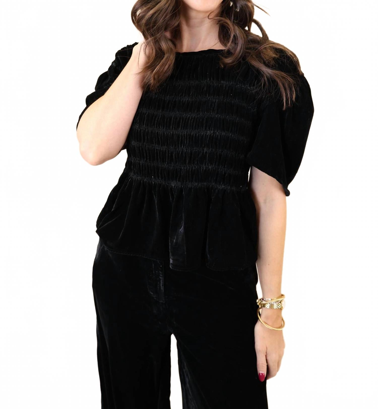 Сочетайте эту блузку с любимыми джинсами и шлепанцами для следующего девичника. Подчеркните свой повседневный образ с помощью блузки Forrest Stretch Velvet Top от Dèluc - шикарной вещи с особым сиянием. Эта однотонная черная блузка с короткими рукавами и вырезом-лодочкой украшена сборками и воланами для дополнительной элегантности. Ее состав из эластичного бархата состоит на 92% из полиэстера и на 8% из спандекса. Наслаждайтесь удобством надевания, а для поддержания свежести рекомендуется машинная стирка и сушка на воздухе. Идеально подходит для отпуска и Дня матери, она прекрасно воплощает монохромный тренд.