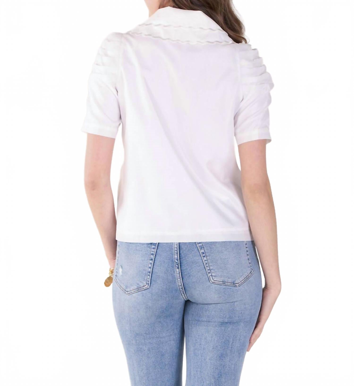 Сочетайте эту блузку с любимыми джинсами и шлепанцами для следующего девичника. Представляем блузку Cameron с фестончатым воротником от Emily McCarthy - изысканное изделие из белой тафты. Эта блузка, сшитая из роскошного шелка, имеет короткие рукава и смелый фестончатый воротник, дополненный присборенными плечами, что придает ей нотку винтажной женственности. Застежка на пуговицы спереди обеспечивает удобство ношения, а свободный силуэт идеально подходит для теплых весенних дней. Уход: ручная стирка для сохранения элегантности и качества.