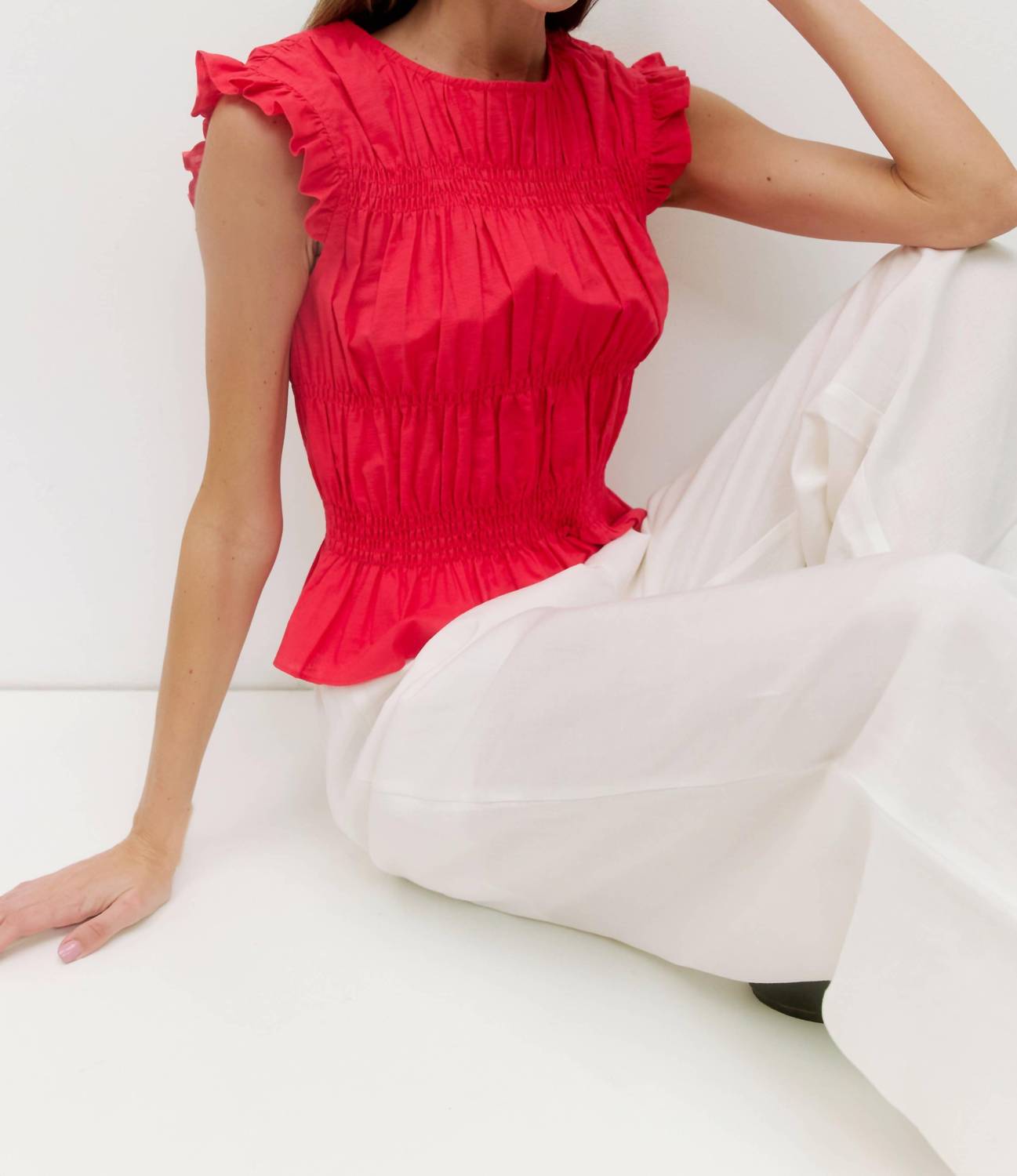 Универсальная блузка, подходящая как для работы, так и для ужина! Представляем блузку Eugenie от MOD REF - яркую красную блузку, идеально подходящую для обновления вашего гардероба. Эта модель без рукавов имеет мягкие короткие рукава с нежными оборками и высокий круглый вырез, создавая элегантный и удобный образ, подходящий для ношения с бюстгальтером. Присборенная талия обеспечивает привлекательный силуэт и комфортную посадку, а удобная завязка сзади дополняет образ. Изготовлена ​​из легкой тканой ткани с тонкой текстурой, идеально подходит для ручной стирки и достаточно универсальна для любого случая.