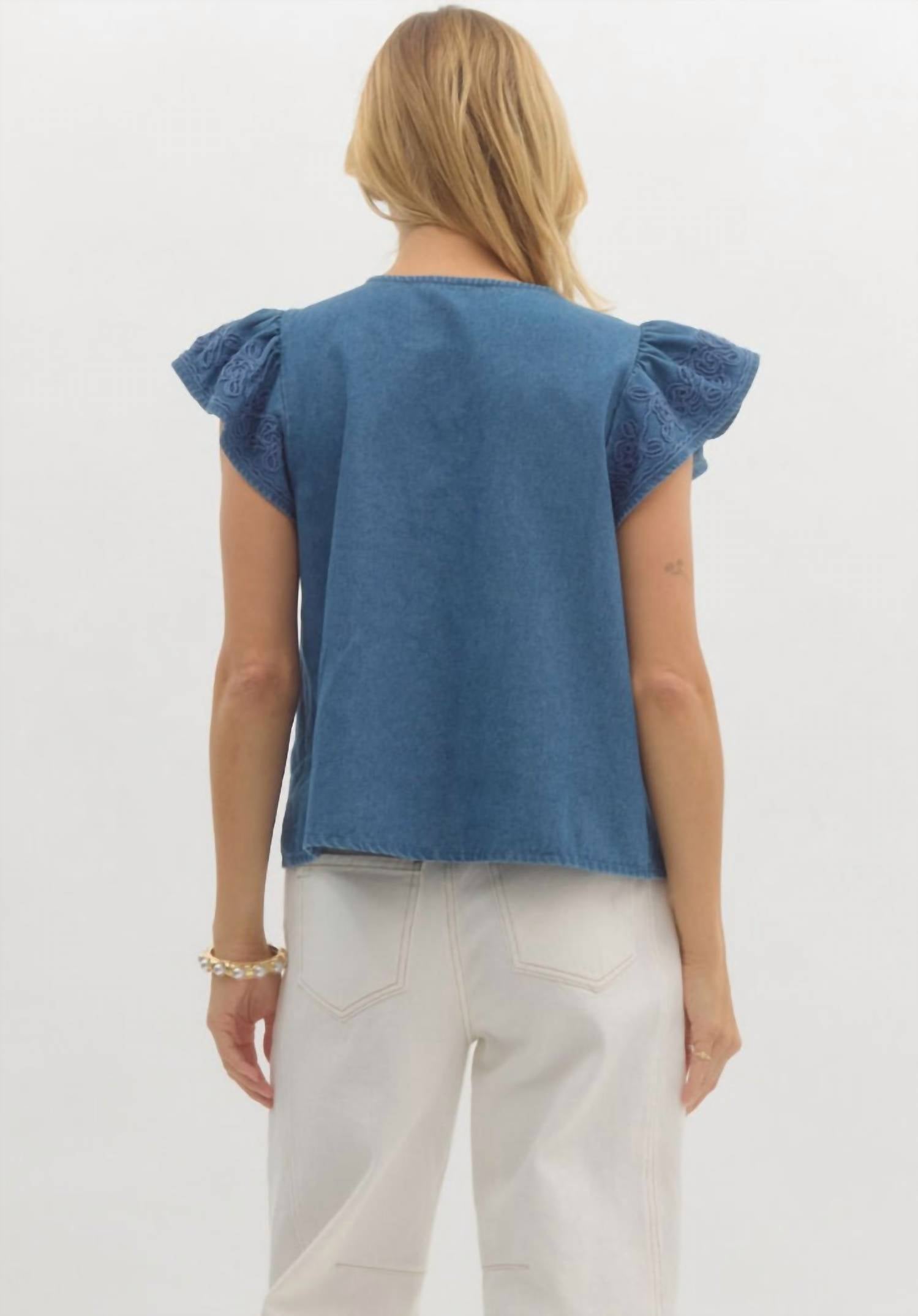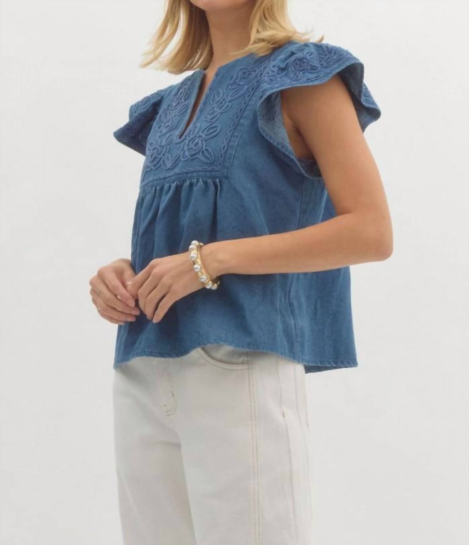 Универсальная блузка, подходящая как для работы, так и для ужина! Представляем джинсовую блузку Jenna от Entro - очаровательное дополнение к вашему весеннему гардеробу. Эта синяя блузка с короткими рукавами-крылышками и V-образным вырезом создает винтажный образ, идеально подходящий для любой праздничной вечеринки. Изготовленная из фактурного хлопка, она обеспечивает легкость и комфорт, не просвечивая. Застежка - надевается через голову. Уход - ручная стирка, сушка на воздухе.