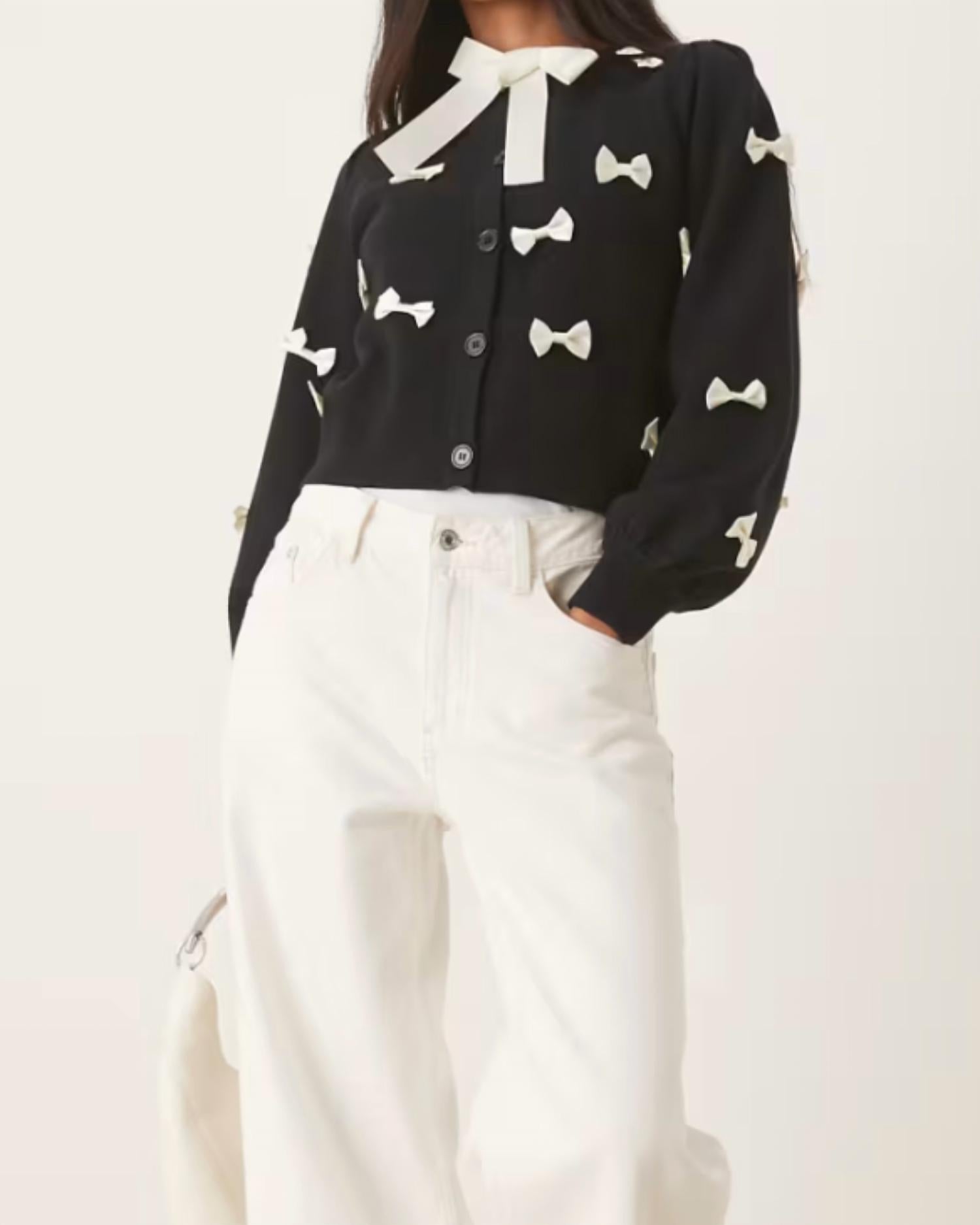 Этот кардиган станет вашим любимым свитером. Ощутите вневременную элегантность с кардиганом SOPHIA BOW от Never Fully Dressed - стильным дополнением к вашему гардеробу в однотонном черном цвете. Этот кардиган с длинными рукавами украшен изысканным контрастным бантом и имеет круглый вырез для завершенного образа. Изготовленный из вискозной ткани средней плотности, он застегивается на пуговицы для удобства ношения. Уход - машинная стирка в соответствии с инструкциями на этикетке. Идеально подходит для перехода от дневного образа к вечернему, этот кардиган станет отличным выбором для начала учебного года благодаря своему трендовому стилю Y2K.