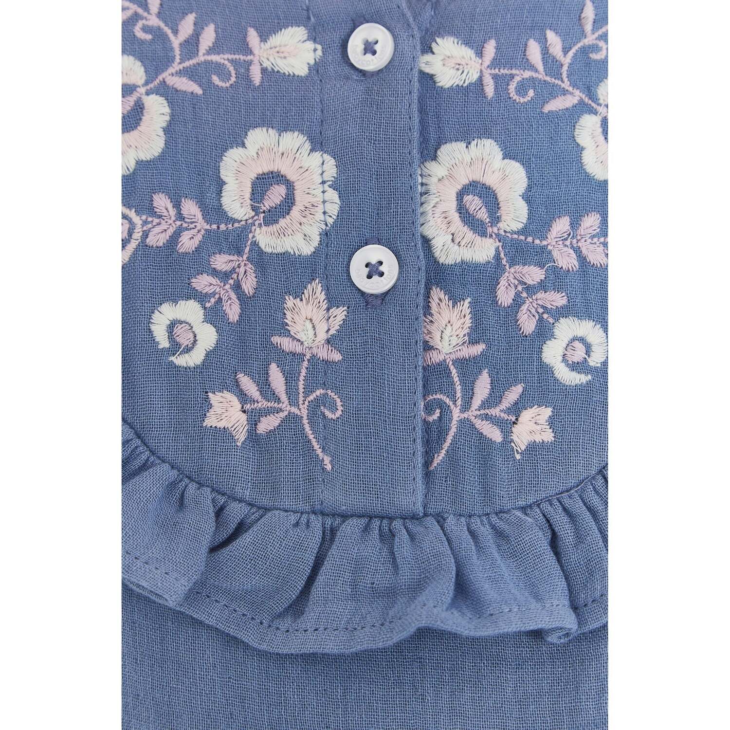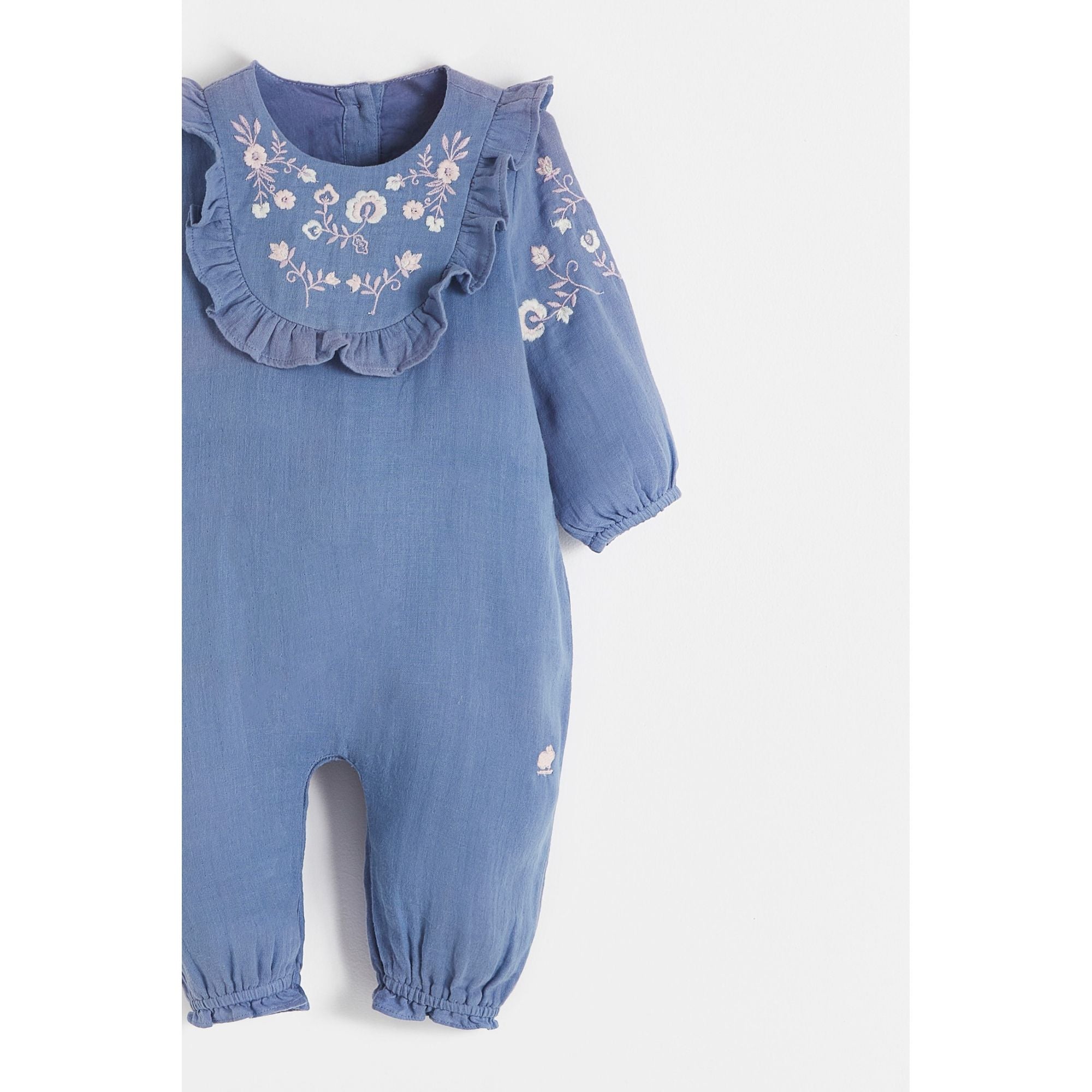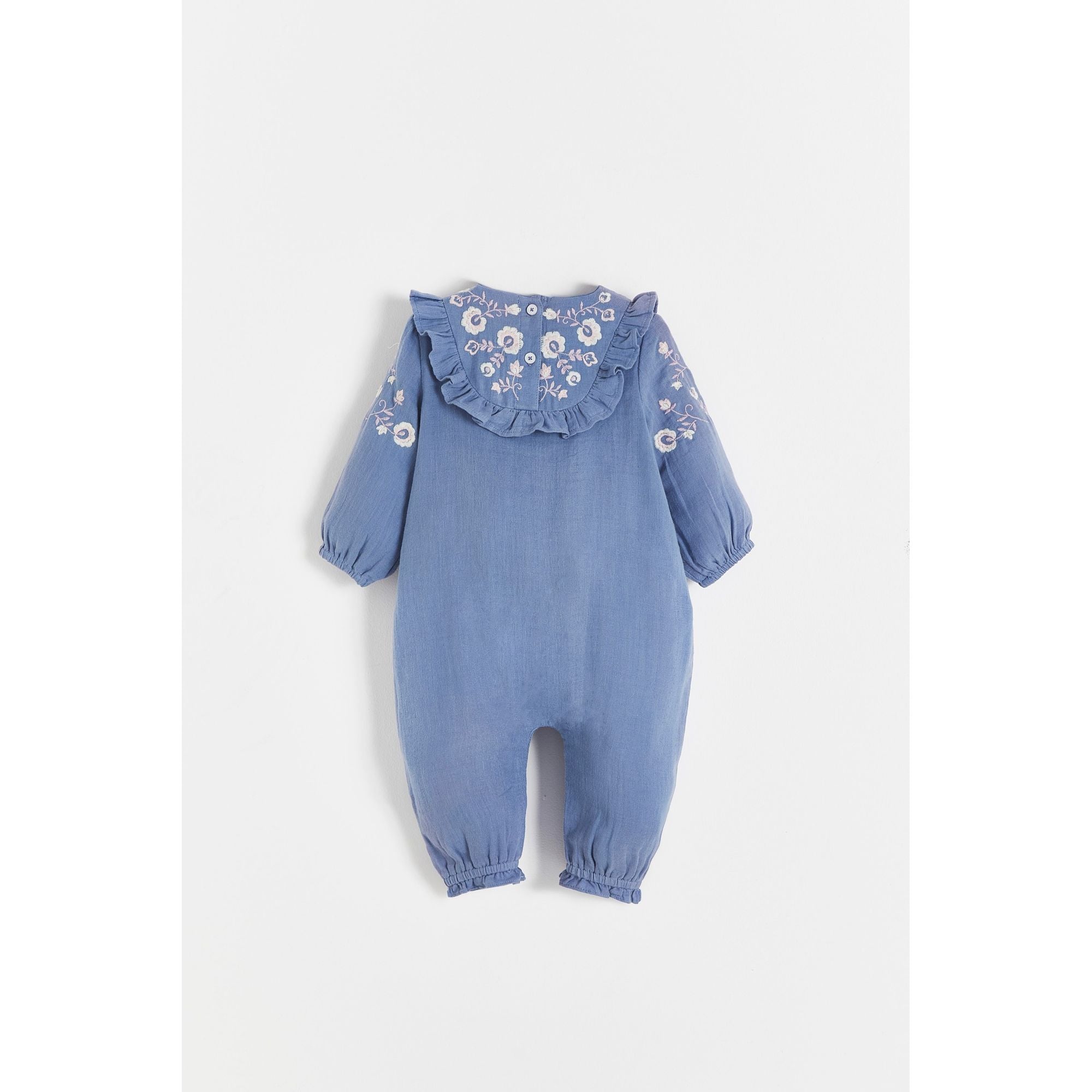 Комбинезон нежно-голубого цвета из муслина с цветочной вышивкой и широкими длинными рукавами. Также имеется задний карман по центру с пуговицами для удобства использования. Мягкая ткань обеспечивает комфорт и свежесть, позволяя свободно двигаться и наслаждаться повседневными занятиями.