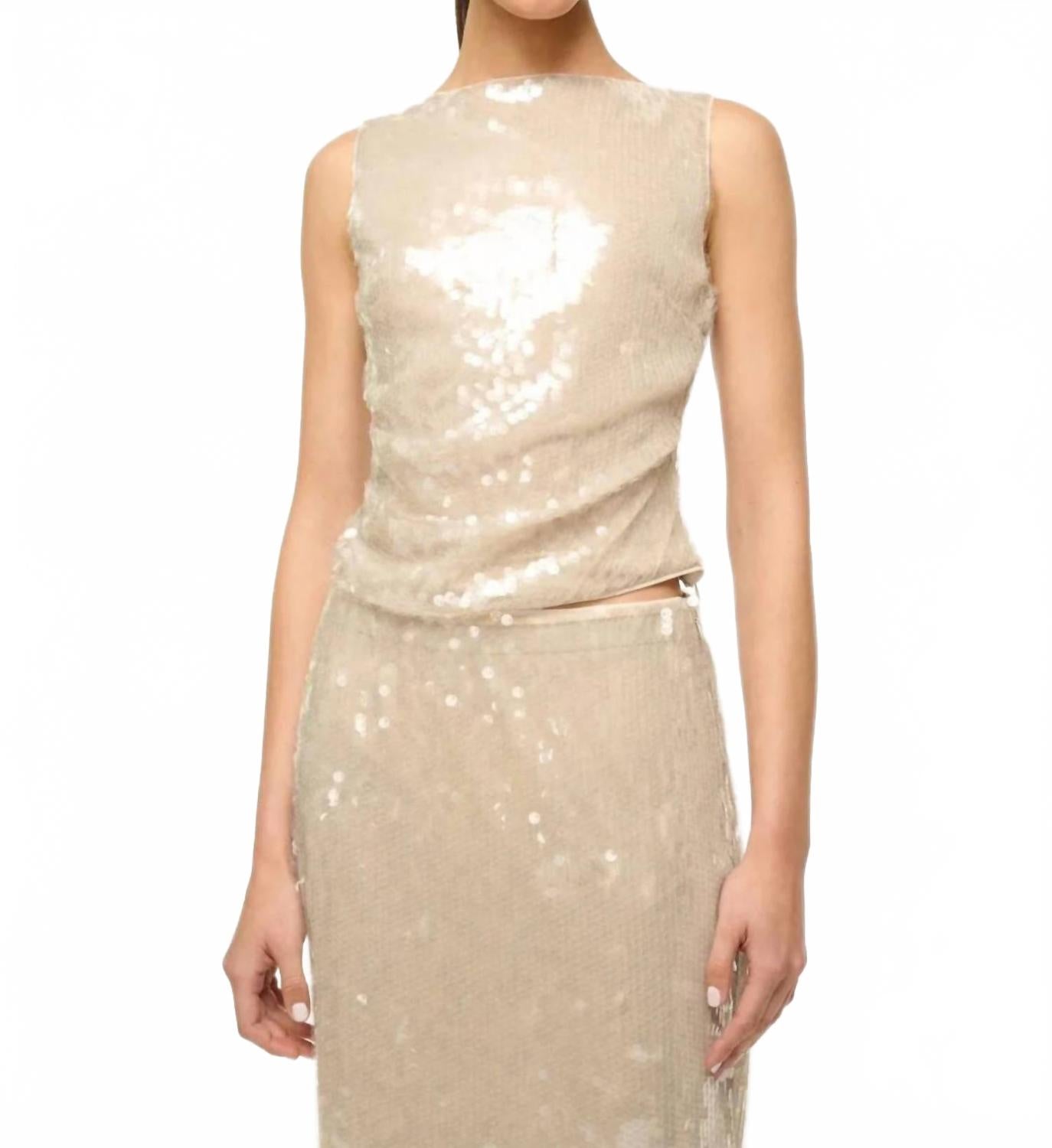 Идеальная майка для теплого времени года. Представляем майку Eton от STAUD - идеальный вариант для праздничной вечеринки в нежном лунном цвете. Эта модель без рукавов с воротником-стойкой изготовлена ​​из 100% полиэстера с подкладкой из 86% полиамида и 14% спандекса, отличаясь элегантным фактурным узором. Благодаря стильной застежке на пуговицы и потрясающей асимметричной драпировке на талии, она воплощает тренд на сдержанную роскошь. Для ухода за этим изысканным изделием достаточно химчистки, чтобы сохранить его элегантность.
