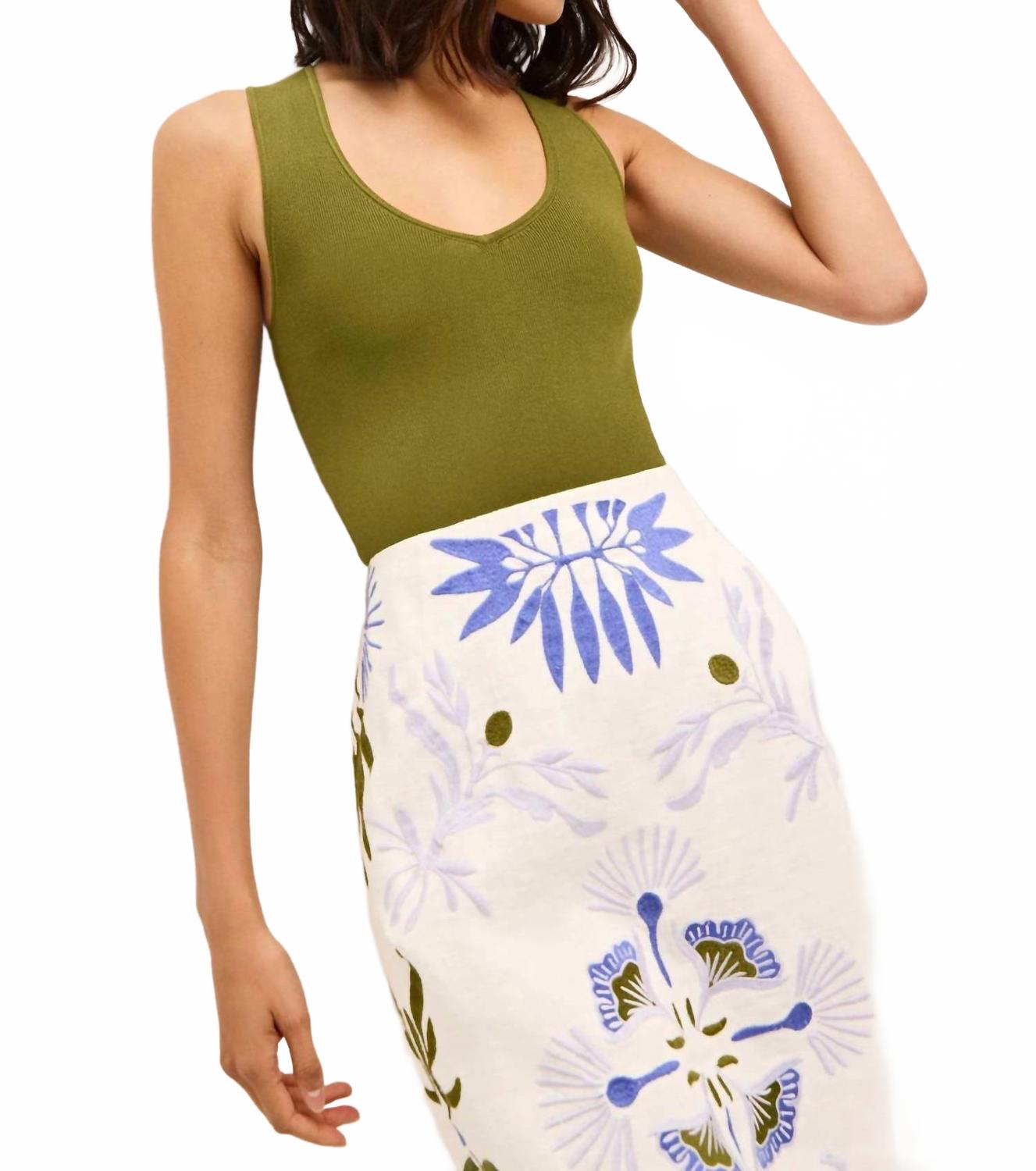 Эта майка без рукавов свежего оттенка, напоминающего цвет песто, - незаменимый элемент летнего гардероба, отличающийся непринужденной привлекательностью. Модель с облегающим вырезом и силуэтом выполнена из мягкой ребристой вязки, которая комфортно облегает тело, оставаясь при этом легкой. Простой фасон без подкладки делает ее удобной и универсальной вещью, которая идеально подходит как для самостоятельного ношения, так и для создания летних образов.