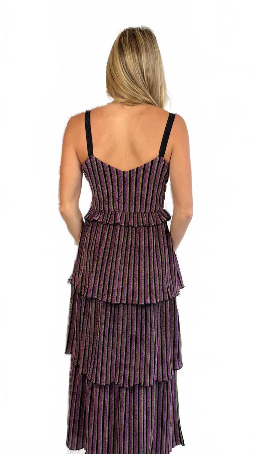 Дополните это макси-платье любимым массивным ожерельем и сандалиями для создания идеального образа. Миди-платье в полоску с люрексом. Вырез «сердечко». Широкие бретели. Скрытая боковая молния. Многослойная юбка. Смесь полиэстера и спандекса. Подкладка. Соответствует размеру.