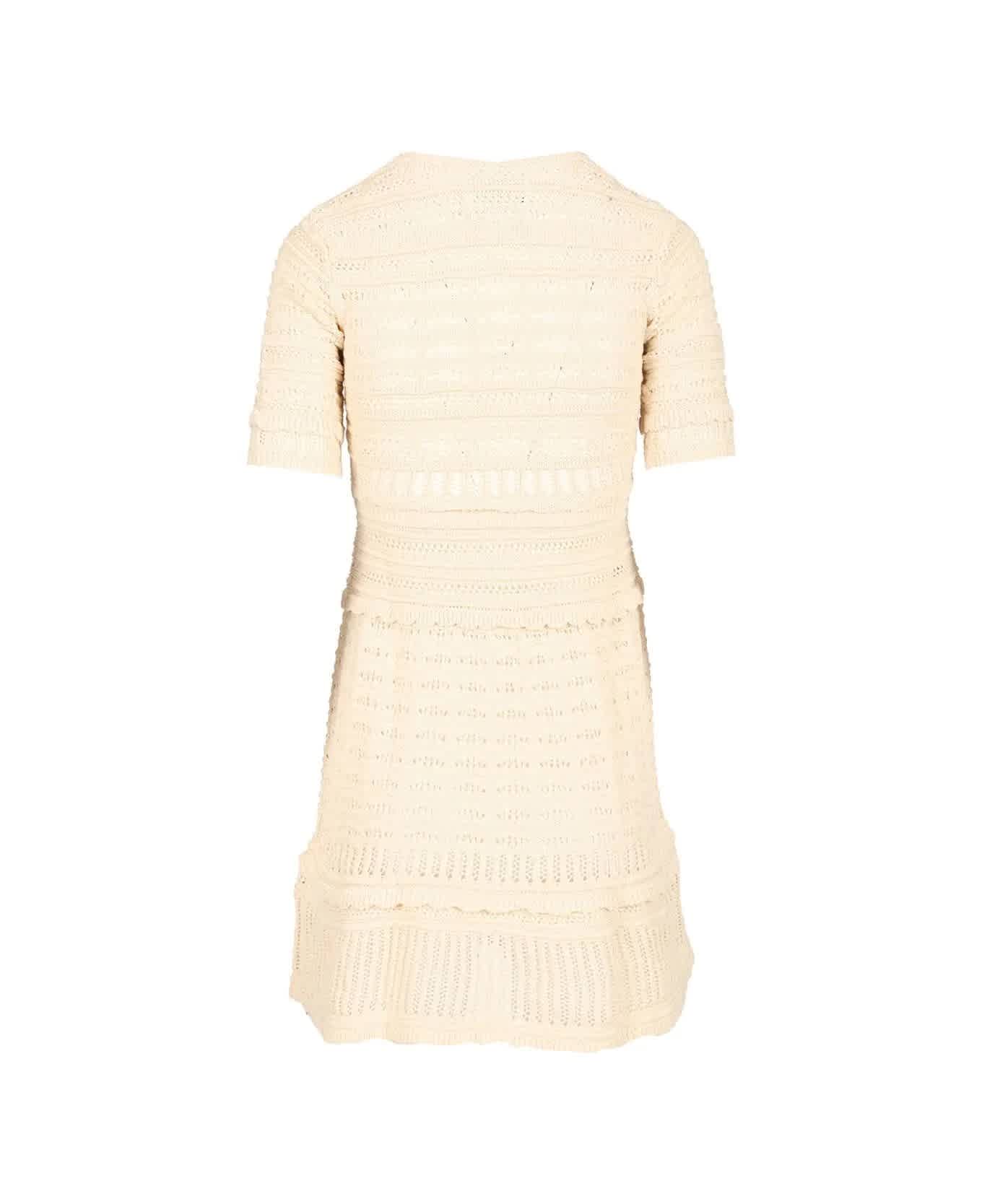 Женские платья Isabel Marant Etoile. Цвет - Экрю. Мини-платье Isabel Marant Étoile Abril выполнено из ажурного трикотажа, сочетающего в себе непринужденное очарование и фирменную парижскую элегантность. Платье с глубоким круглым вырезом и рукавами три четверти имеет приталенный силуэт, создающий льстящий фигуре женственный образ. Детали: ажурная трикотажная конструкция; глубокий круглый вырез; рукава три четверти; приталенный силуэт; мини-длина.