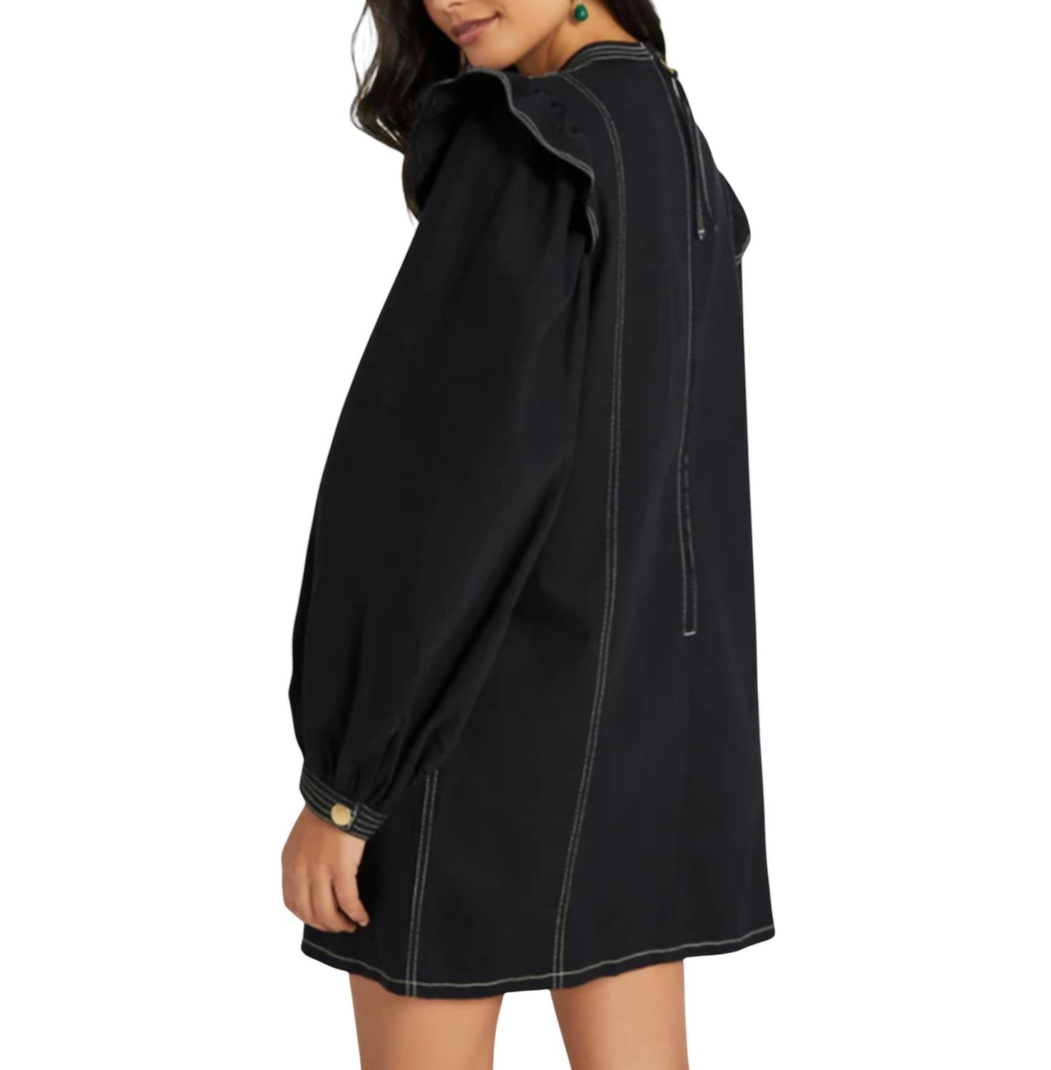 Короткое и воздушное платье для теплых дней. Откройте для себя мини-платье с оборками на плечах от SOMETHING NAVY - стильное дополнение к вашему гардеробу, выполненное в универсальном черном цвете. Это минималистичное платье-футляр с длинными рукавами и стильными оборками на плечах идеально подойдет для любого званого ужина. Изготовленное из высококачественного хлопка, оно имеет свободный крой, практичную застежку-молнию и удобные карманы. Создайте изысканный образ этой весной с помощью силуэта с воротником-стойкой, излучающего элегантность.