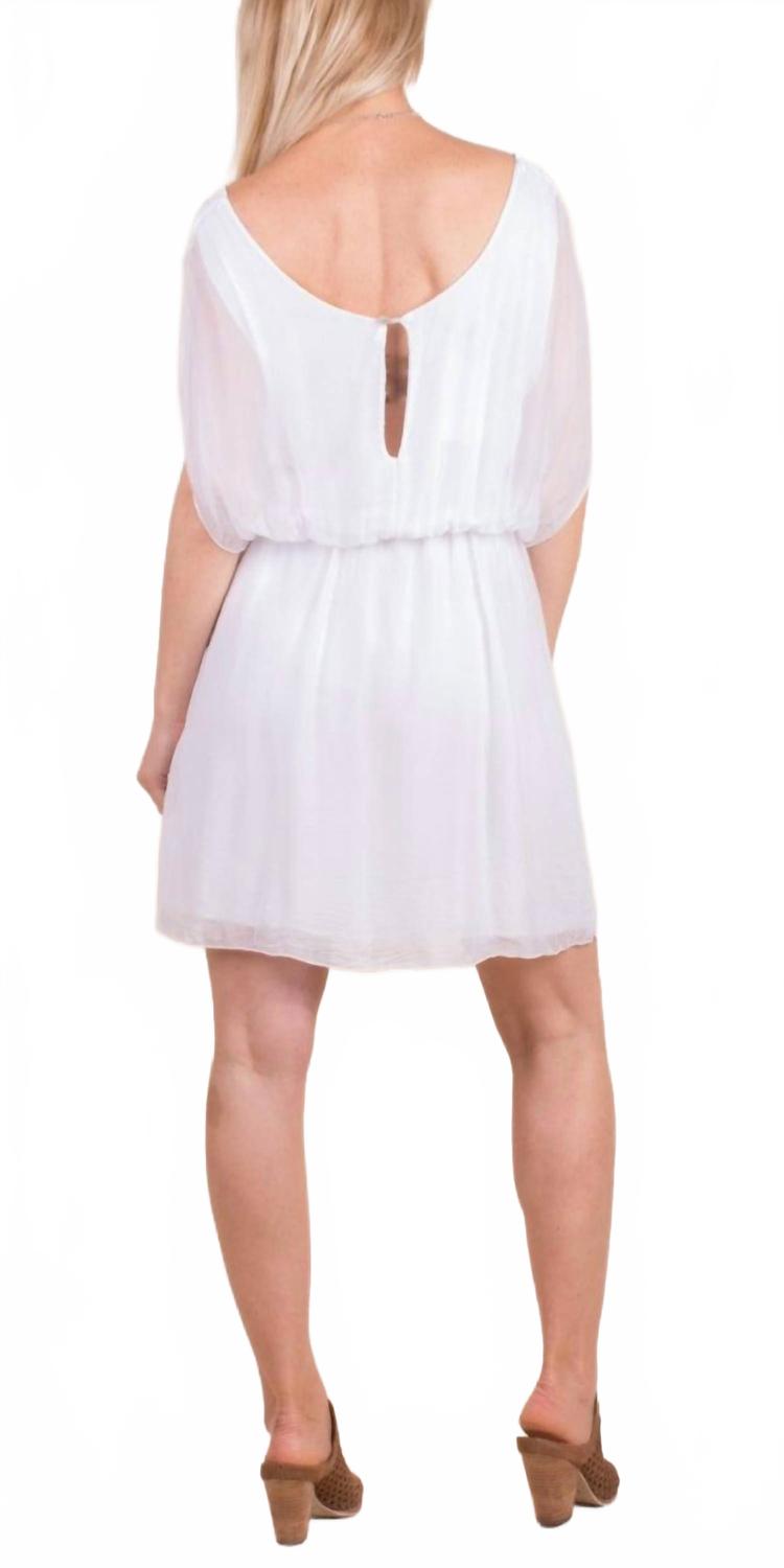Короткое и воздушное платье для теплых дней. Оцените элегантность шелкового мини-платья GIGI MODA Lodi, созданного для минималистичного летнего стиля. Изготовленное в Италии, это платье имеет короткие рукава и облегающий силуэт с вырезом-лодочкой. Изготовленное из роскошной смеси 30% шелка и 70% вискозы снаружи, с мягкой внутренней подкладкой из 95% вискозы и 5% эластичной ткани, оно обеспечивает комфортную посадку и выполнено в классическом белом цвете. Платье имеет эластичную талию и застежку-кнопку на спине для удобства. Уход: ручная стирка по мере необходимости. Рост модели 170 см, платье доступно в одном размере.