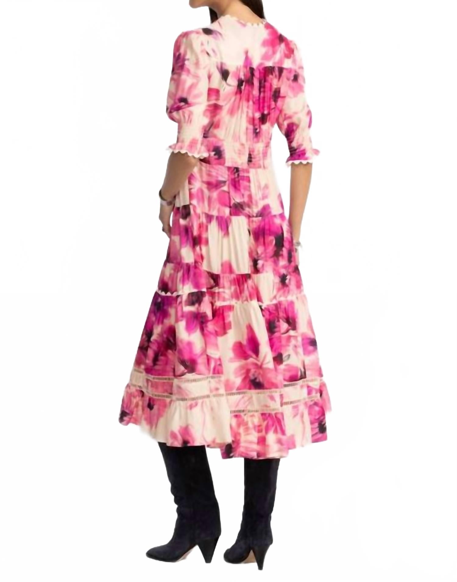 Платье идеальной длины действительно существует. Платье Daphne длиной до колена сшито из уникальной шелковой смеси и украшено яркими цветочными узорами. Оно имеет V-образный вырез, присборенную эластичную талию сзади и эластичные манжеты на рукавах. Это потрясающее платье также имеет боковые карманы и красиво украшенную многоярусную юбку. Для создания нежного образа сочетайте его с босоножками на ремешках и изящными украшениями. Рост модели 180 см, размер S. Химчистка.