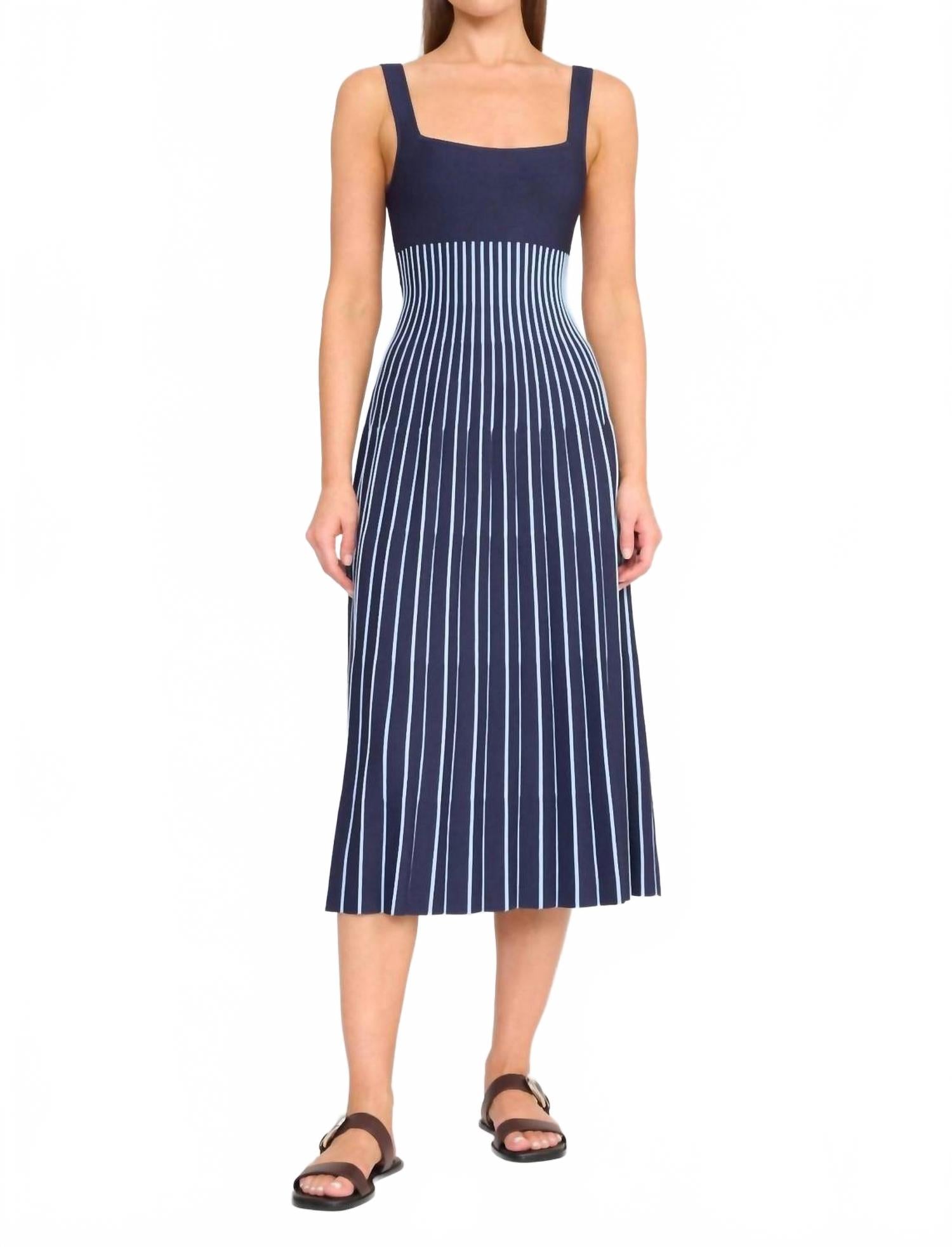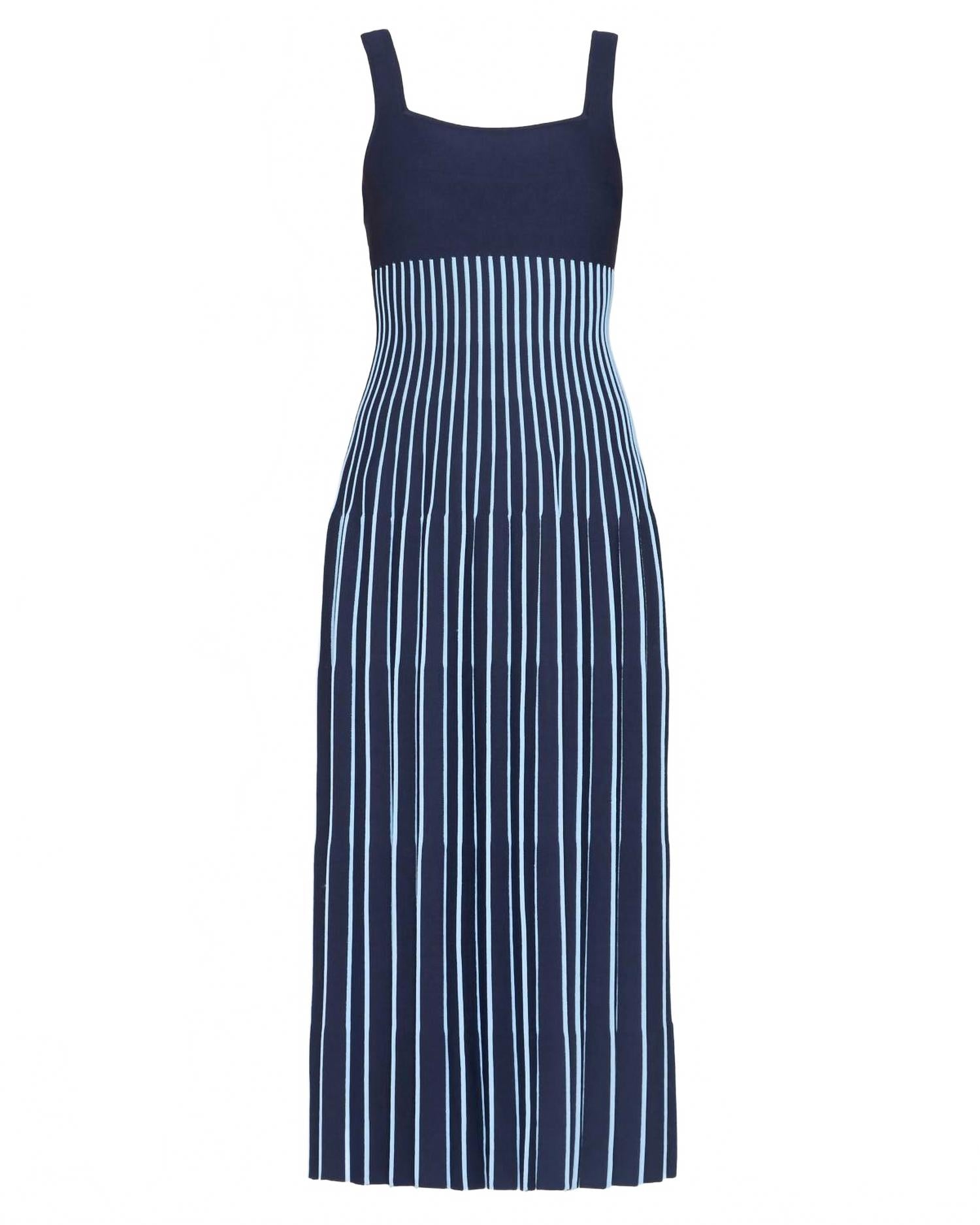 Платье-миди Ellison от STAUD - это шикарный летний вариант в эффектном темно-синем/голубом цвете. Это платье без рукавов имеет квадратный вырез с удобными для ношения бюстгальтера бретелями и А-образный силуэт, украшенный декоративной строчкой на талии для создания привлекательного силуэта. Изготовленное из смеси вискозы (59% вискоза, 40% нейлон, 1% эластан), оно имеет длину миди, обеспечивая элегантную поддержку. Созданное для отдыха, оно легко надевается, создавая изящный образ.