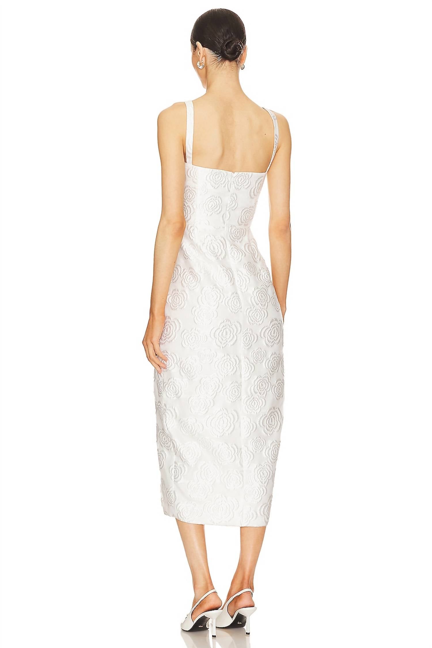 Элегантное белое платье, неподвластное времени. Платье без рукавов, средней длины. Классический облегающий силуэт с небольшим боковым разрезом. Излучает сдержанное очарование благодаря жаккардовой ткани с цветочным узором. Скрытая застежка-молния сзади. Изготовлено из 100% полиэстера. Полностью на подкладке из 95% полиэстера и 5% эластана, что обеспечивает комфортную посадку. Сделано в Китае. Рекомендуется химчистка.