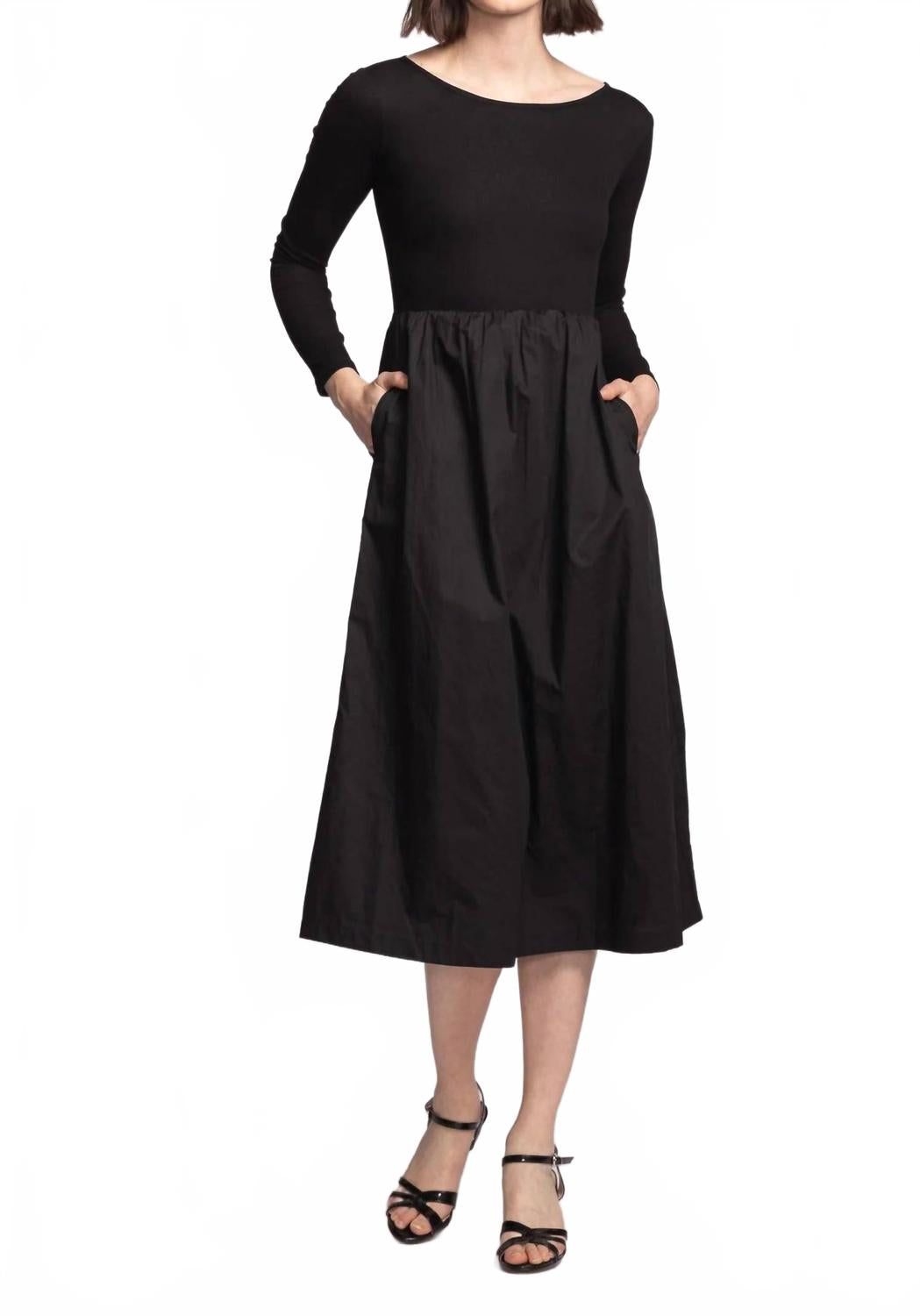 Платье миди настолько универсально, что возможности его ношения безграничны. Откройте для себя платье Nicole от PINK MARTINI - мастерское сочетание комфорта и изысканности в однотонном черном цвете. Это платье миди А-силуэта с длинными рукавами имеет ребристый вырез-лодочку в сочетании с юбкой из контрастной ткани, создавая утонченный, но современный силуэт, идеально подходящий для любого случая. Изготовленное из хлопковой смеси, включающей 80% хлопка, 17% полиэстера и 3% спандекса, это платье обеспечивает идеальную посадку и добавляет функциональной элегантности благодаря карманам. Застежка - надевается через голову.