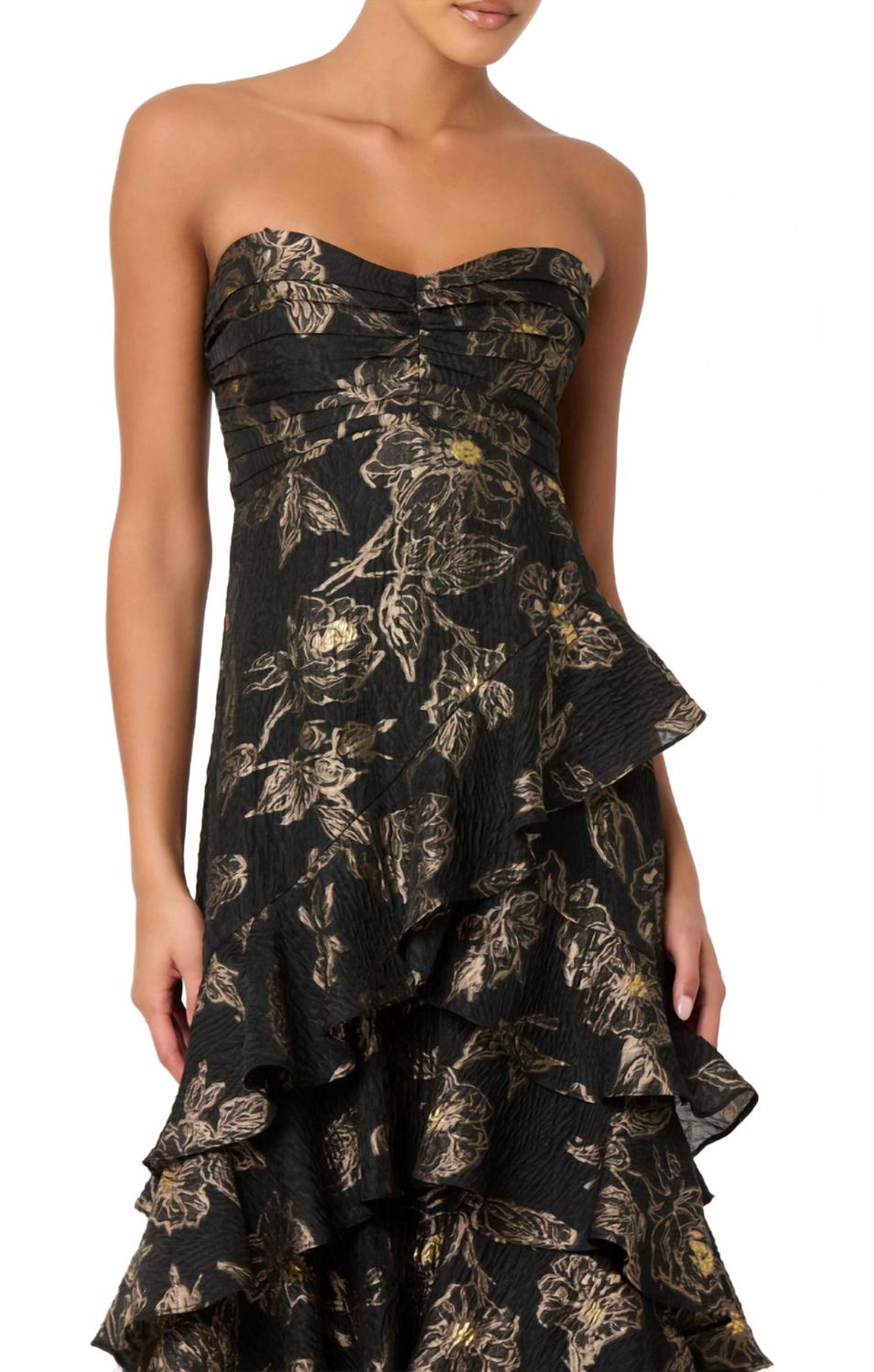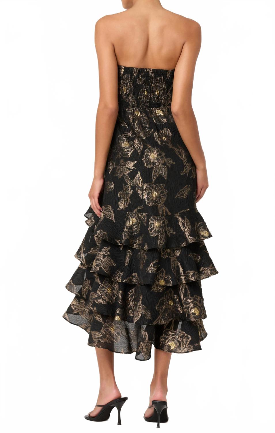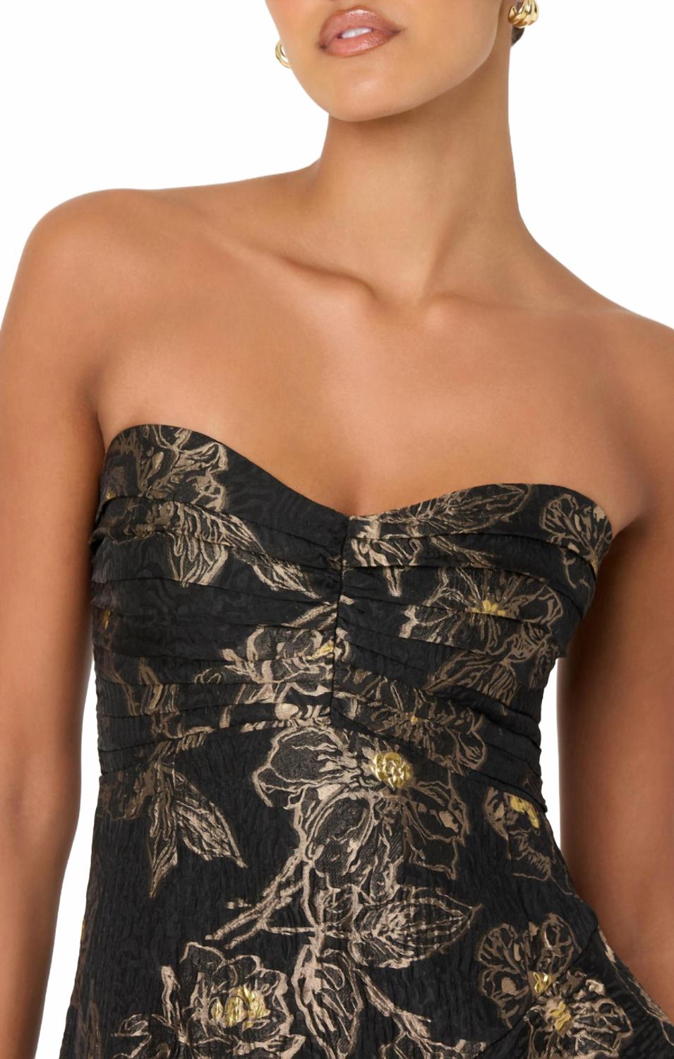 Платье миди настолько универсально, что возможности его ношения безграничны. Представляем платье Marysia от ASTR - эффектное платье миди без бретелей, созданное для элегантности и стиля в черно-золотом цвете. Это платье имеет облегающий верх с вырезом «сердечко» и многослойную юбку миди, которая добавляет динамичности. Богатая ткань с узором идеально подходит для минималистичного, но шикарного образа, идеально подходящего для коктейльных вечеринок и вечерних торжеств. Застежка - молния. Уход - только химчистка.