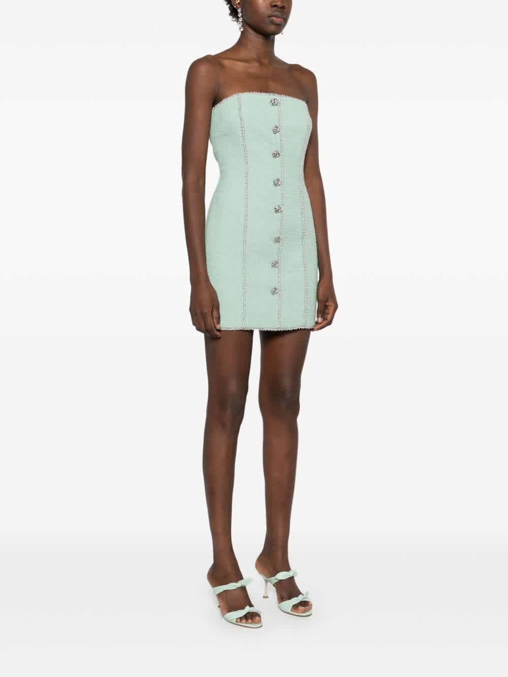 Платья Rotate для женщин. Категория моды - Коктейльные и вечерние платья. Цвет - Спрей. Мини-платье без бретелей Rotate из букле. Это мини-платье имеет облегающий силуэт без бретелей, украшенный серебристыми пуговицами в форме роз спереди для придания элегантности. Изготовлено из фактурной букле из переработанного полиэстера, имеет металлизированную отделку по швам и открытую молнию с логотипом R сзади. 100% переработанный полиэстер.