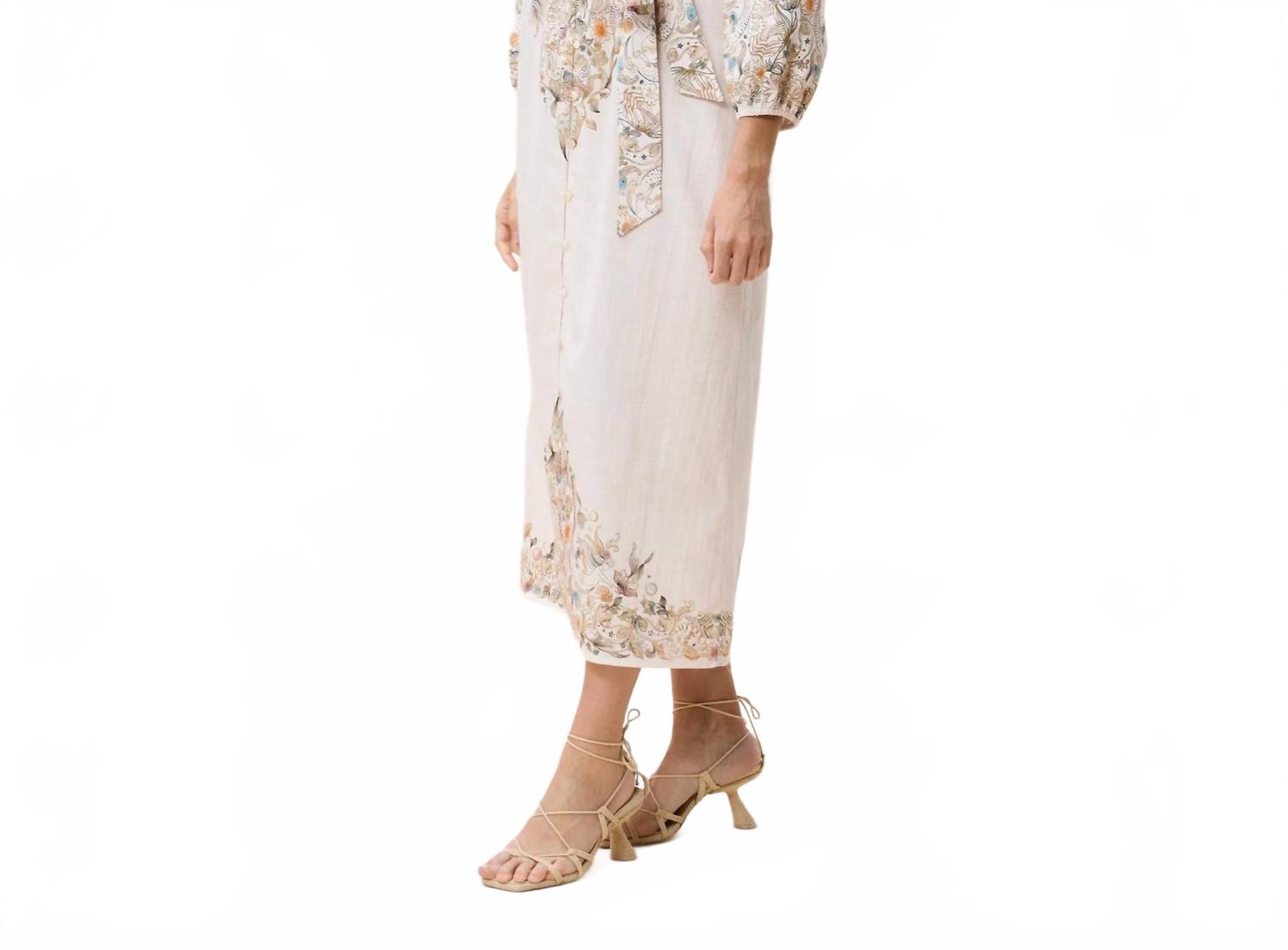 Представляем платье-миди Seema от Cleobella - потрясающее дополнение к вашему гардеробу, изготовленное из 100% органического хлопка, сертифицированного GOTS, элегантного кремового цвета. Это платье с длинными рукавами и съемным поясом на талии подчеркивает его свободный А-образный силуэт и шикарный V-образный вырез. Изготовленное вручную в Индии с соблюдением этических норм, оно имеет застежку на пуговицах для удобства надевания и украшено продуманным цветочным принтом для создания разнообразных образов. Уход за изделием: ручная стирка в холодной воде, сушка в расправленном виде или химчистка.