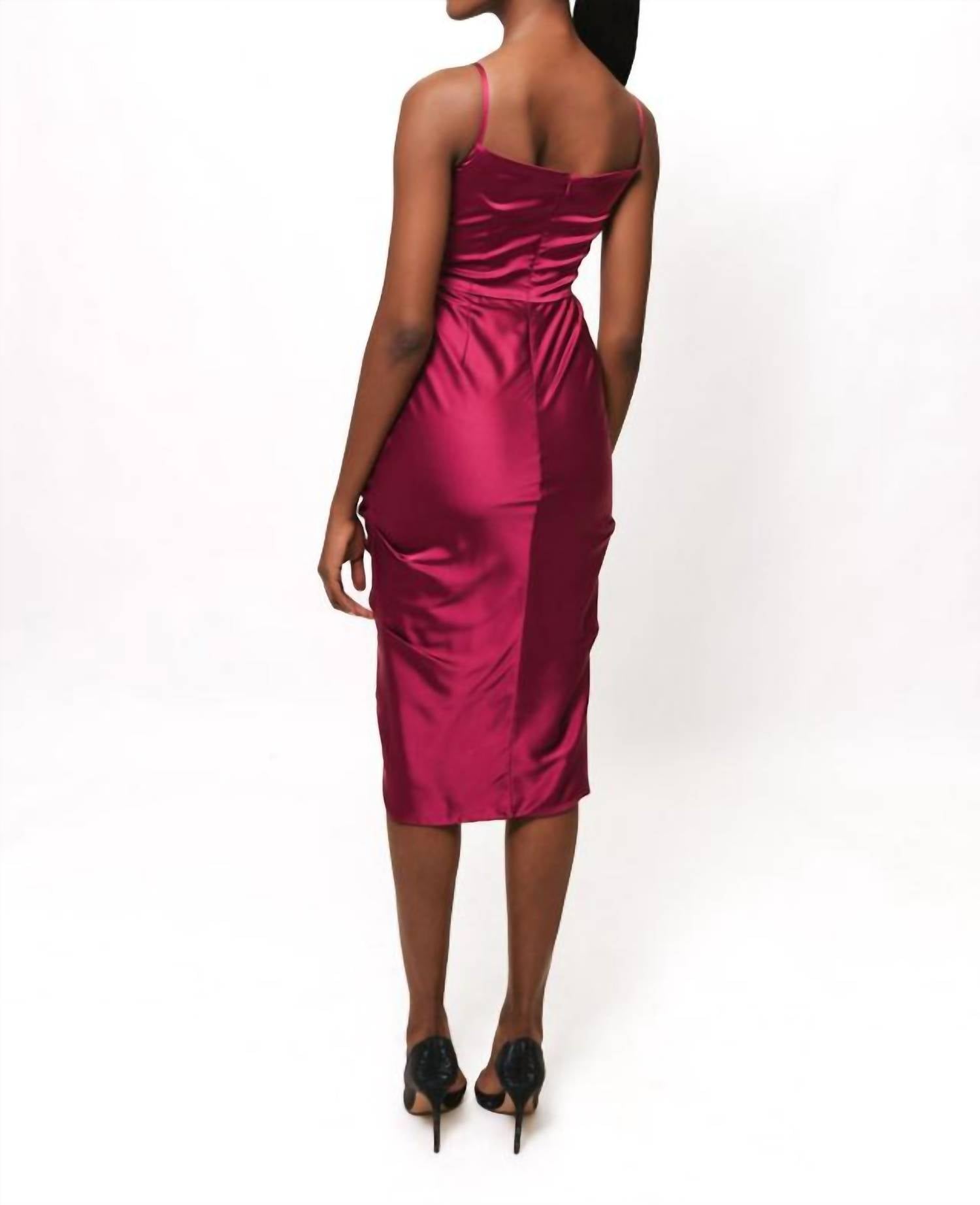 Просто добавьте шлепанцы или мюли, и вы готовы. Подчеркните свой вечерний образ платьем Sanra от Hutch, которое отличается изящными деталями без рукавов и регулируемыми тонкими бретелями. Это сливовое платье миди с роскошным атласом имеет драпировку по всей поверхности и привлекательный силуэт «русалка». V-образный вырез добавляет элегантности, а подкладка обеспечивает идеальную посадку. Застежка - молния. Идеально подходит для любого торжественного случая.