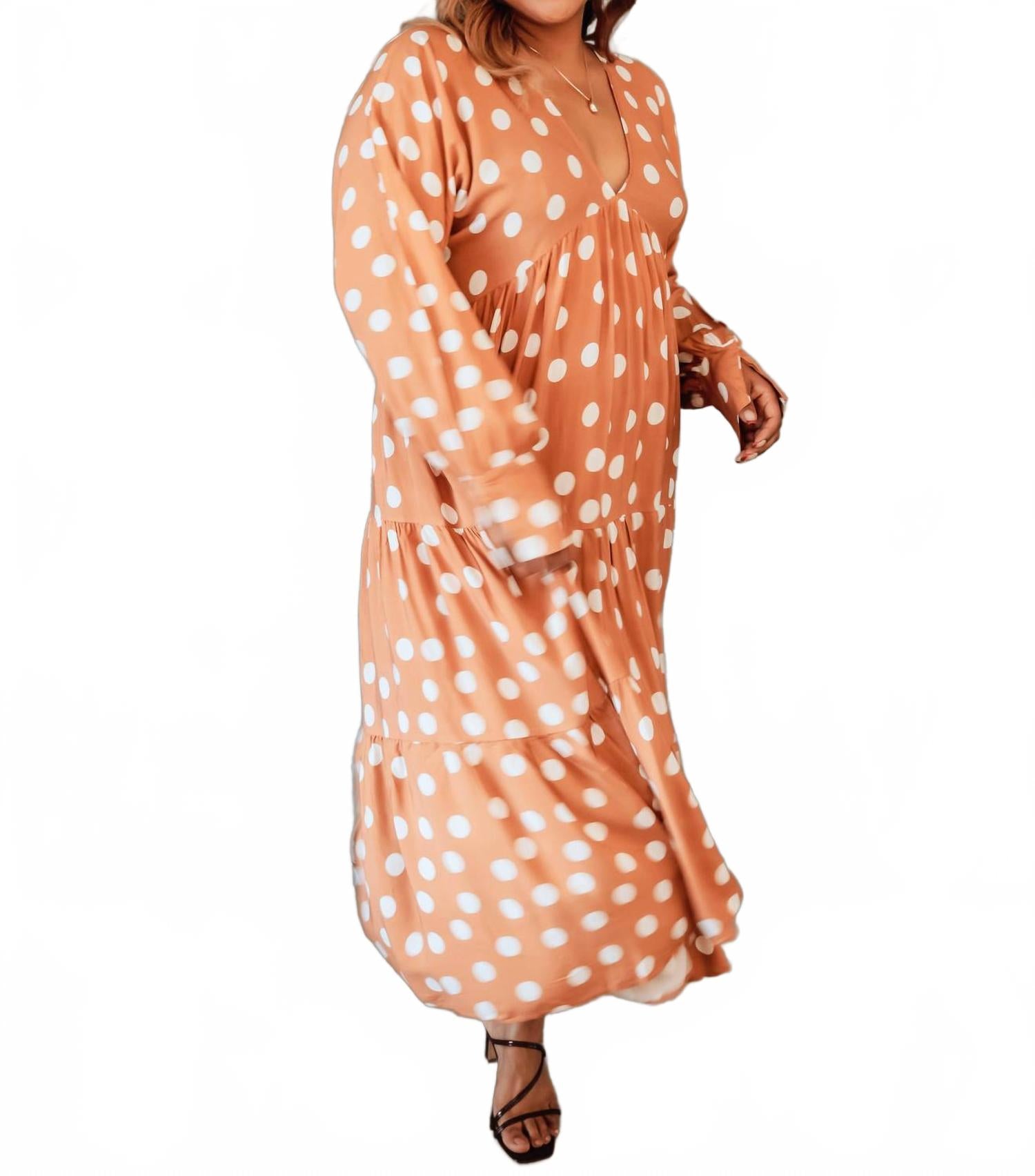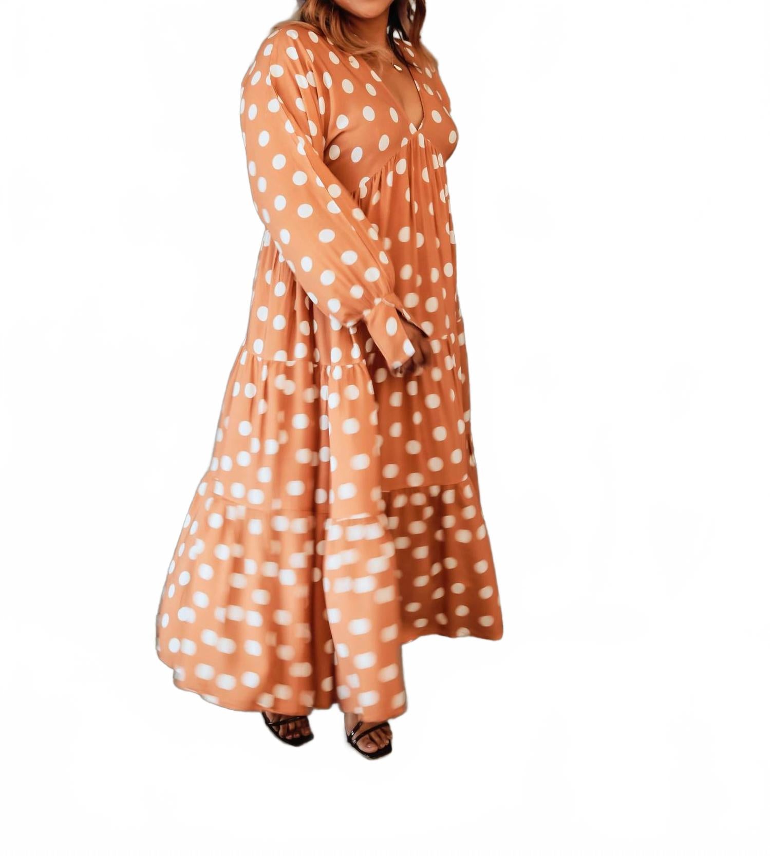 Просто добавьте шлепанцы или мюли, и вы готовы. Представляем платье-миди Mable от BLAKELEY - очаровательную вещь для вашего летнего гардероба. Это коричневое платье А-силуэта с игривым узором в горошек и элегантными длинными рукавами-фонариками с манжетами на пуговицах идеально подойдет для вечеринки в честь рождения ребенка или празднования 4 июля. Лестный V-образный вырез и струящиеся ярусы платья создают изящное движение, подчеркивая его максималистский тренд. Платье с застежкой-молнией для удобства надевания, легко стирается в машине. Модель носит размер Medium.