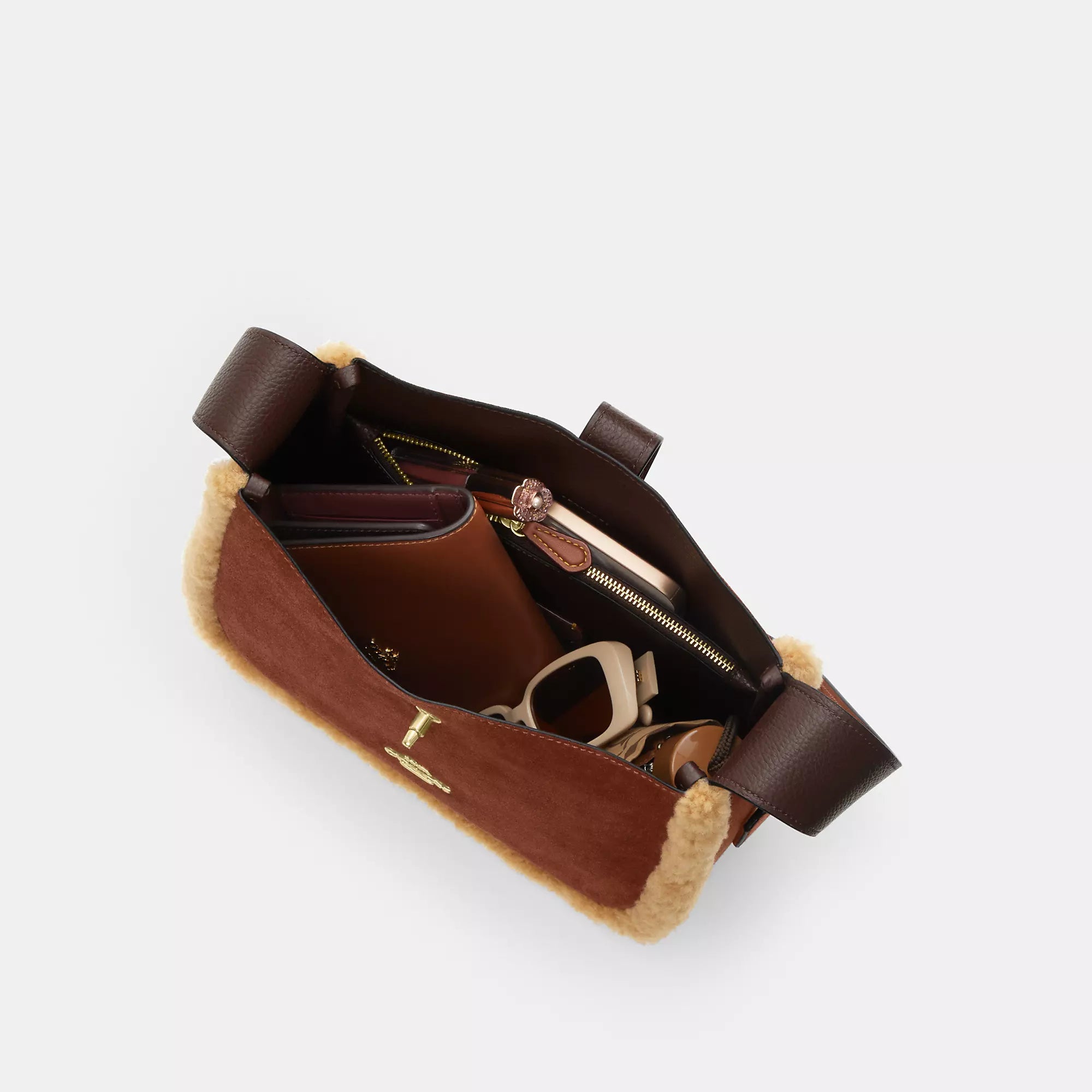 Замша, изысканная зернистая кожа и овчина. Внутренний карман на молнии. Застежка-поворотный замок. Тканевая подкладка. Регулируемый ремешок длиной 20 1/2 дюйма для ношения на плече или через плечо. 9 3/4 (Д) x 9 1/2 (В) x 3 1/4 (Ш) дюйма. Coach Outlet Hadley Convertible Crossbody Bag - Коричневая, Размер - Средний