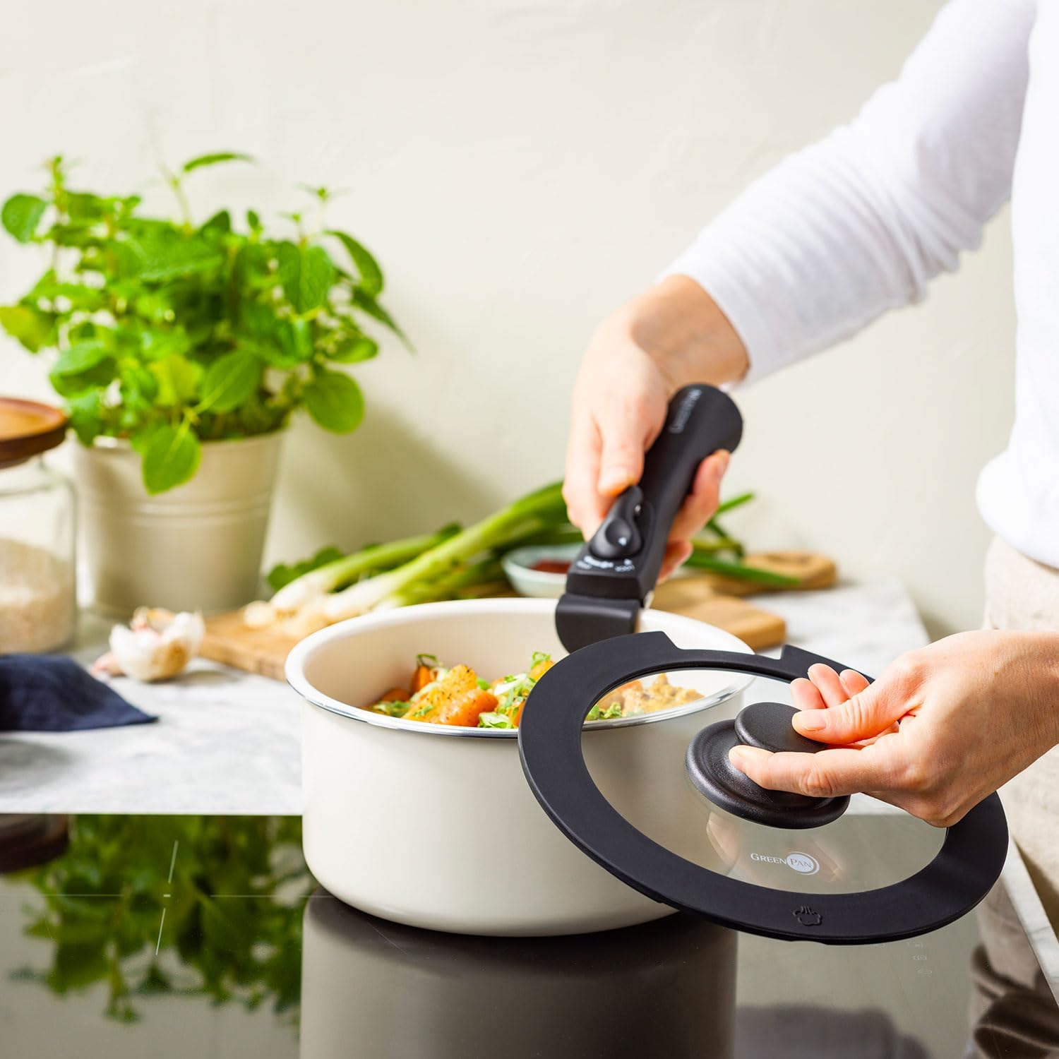 Размеры (диаметр x высота): 22 x 10 см (220 x Вес: 0,7 кг (706 г) Одна зеленая сковорода со съемной ручкой из серии Click Chef (20 см (20 см)) Вместительный и удобный размер для подачи супов. Благодаря простой конструкции, его легко разместить на обеденном столе, поэтому мы рекомендуем снять ручку (эксклюзивная съемная ручка продается отдельно) и подавать блюдо как есть.