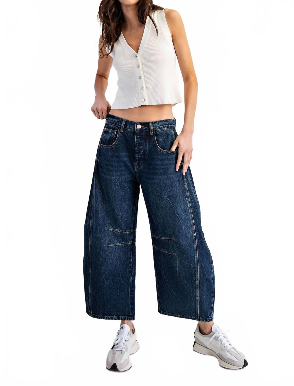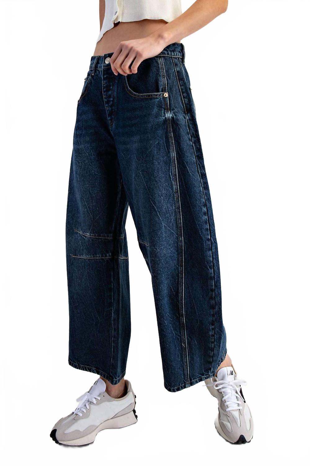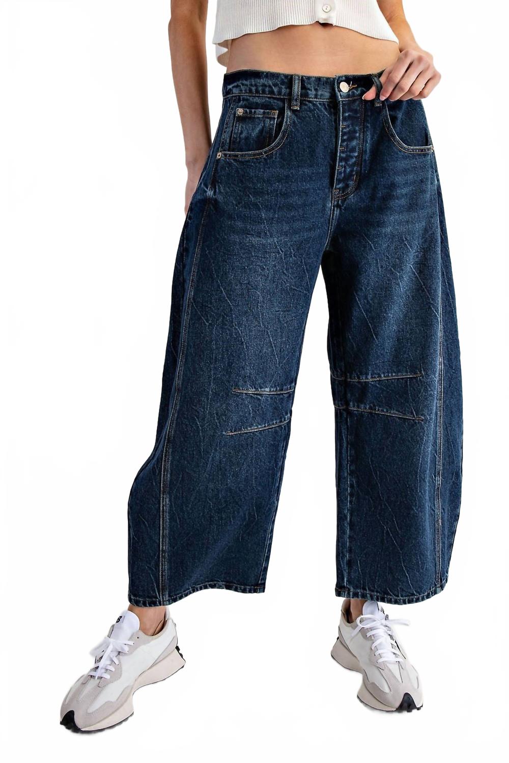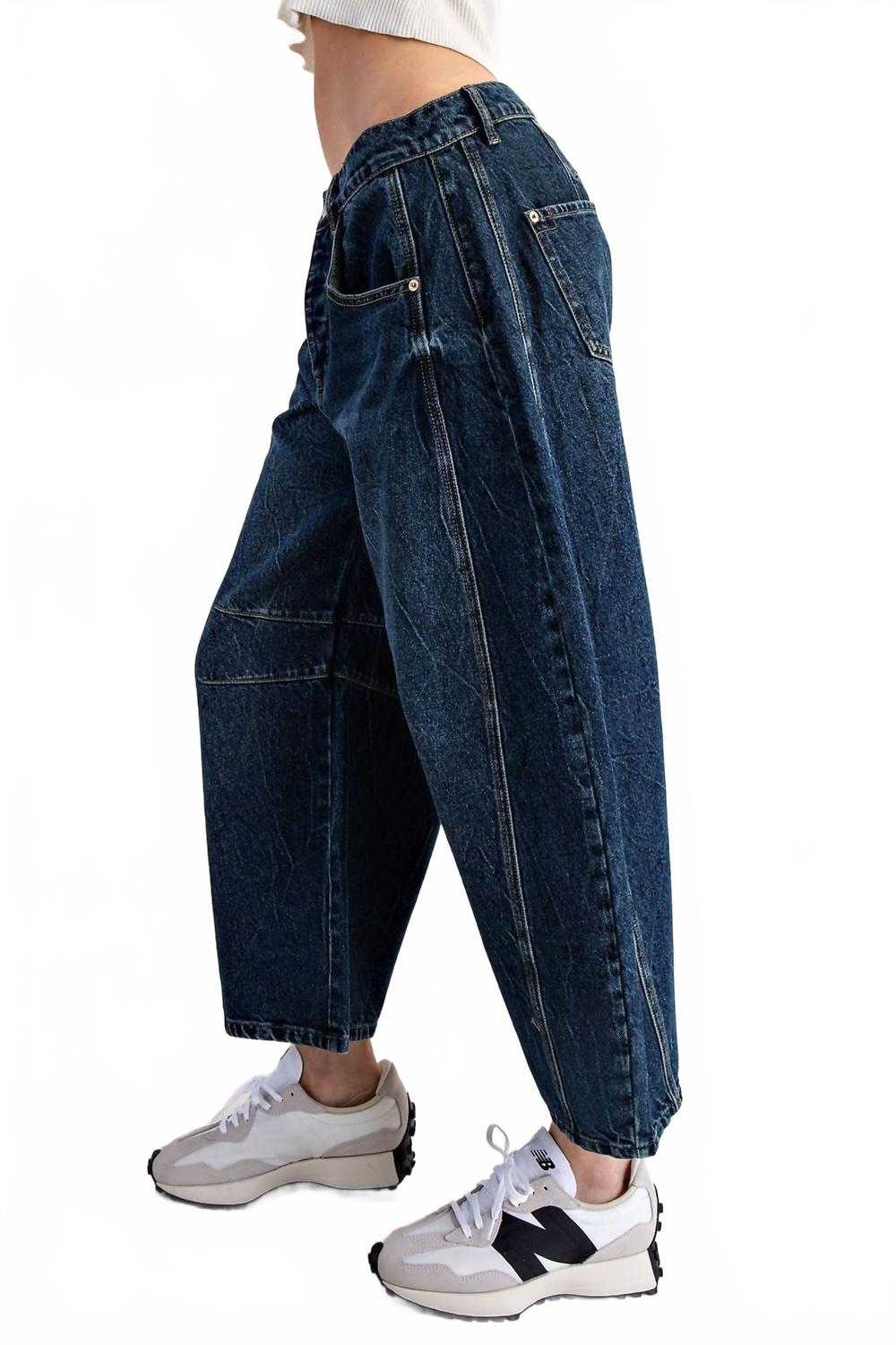 Они такие же милые, как и удобные. Обновите свой гардероб с помощью джинсов ee-some's Dark Washed Barrel Leg Jeans, созданных для современной женщины. Эти синие джинсы имеют свободный широкий крой и темный оттенок с мятой текстурой, что придает им непринужденно стильный, слегка поношенный вид. Застежка на пуговицу обеспечивает надежную посадку, а деталь в виде шва на колене в стиле милитари и классический дизайн с пятью карманами добавляют функциональности. Уход за ними прост: машинная стирка и сушка в сушильной машине делают их идеальными для повседневной летней уличной одежды.