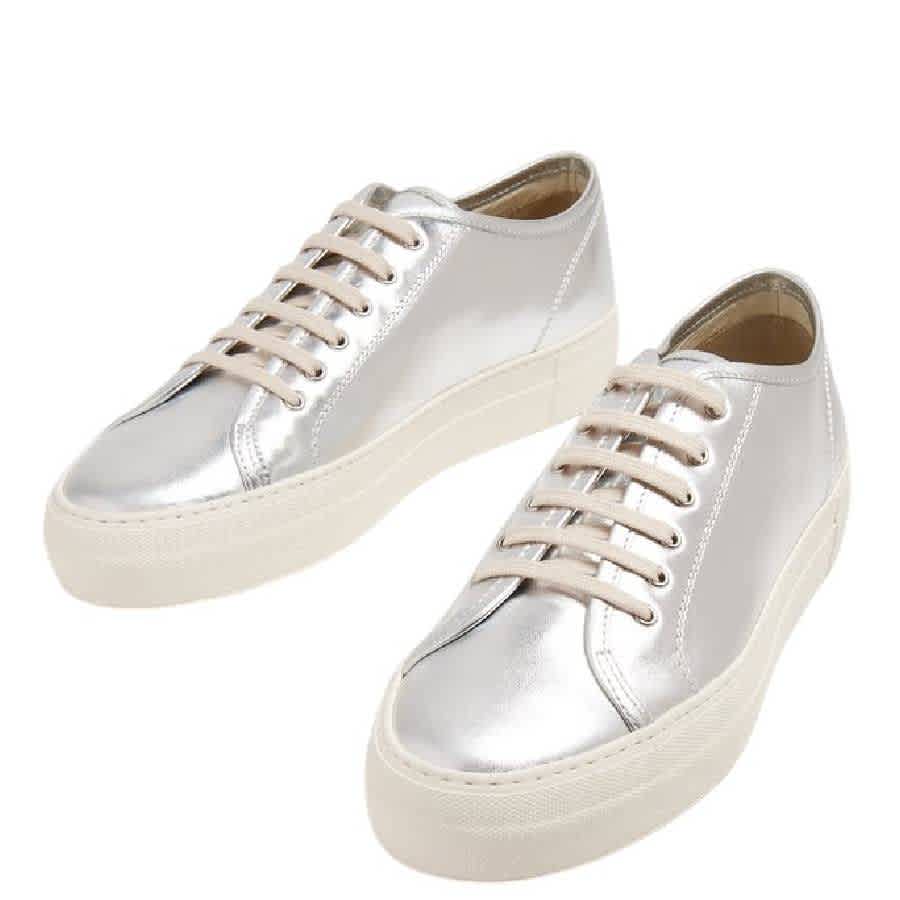 Женские кроссовки Common Projects. Цвет - Серебристый. Тип верха - Шнуровка. Кроссовки Common Projects Tournament Super Low. Эти кроссовки имеют шнуровку, тональную строчку, фирменный серийный номер, выгравированный золотыми буквами на пятке, и круглый носок для классического, изысканного вида. Сделано в Италии. Материал верха - Кожа наппа. Материал подкладки - Кожа. Материал подошвы - Резина.