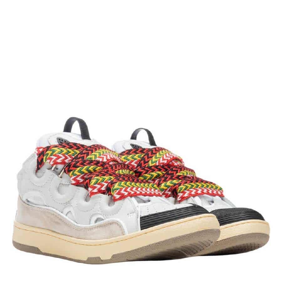Мужские кроссовки Lanvin. Цвет - белый. Кроссовки Lanvin Curb Skate. Эти кроссовки имеют объемный сетчатый верх с замшевыми и нубуковыми накладками, перфорированный носок с контрастной резиновой вставкой и двойную шнуровку с многоцветными жаккардовыми длинными шнурками. Завершают дизайн металлические люверсы, мягкий язычок с серебристой нашивкой с логотипом, тисненый боковой логотип и прошитая резиновая подошва. В комплекте защитный чехол.