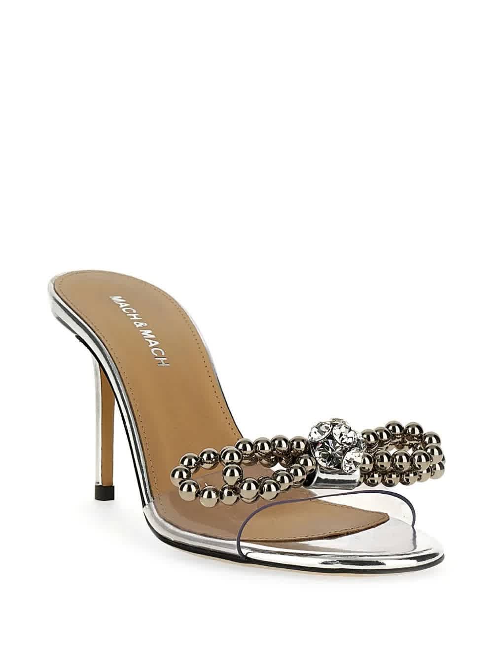 Женские сандалии Mach & Mach. Цвет - Травянисто-серебристый. Сандалии Mach & Mach с бантом из ПВХ. Эти сандалии отличаются минималистичным силуэтом, выполненным из прозрачного ПВХ. Бантик из бисера, украшенный сверкающими кристаллами, добавляет роскоши, а каблук-шпилька придает им изысканность и элегантность. Модель с открытым носком, без застежек, с кожаной подкладкой и кожаной подошвой.