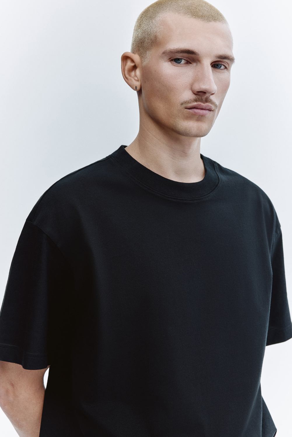 Футболка из хлопкового джерси средней плотности. Круглый воротник с резинкой, заниженная линия плеча, прямой подол. Свободный, но не слишком объемный крой.