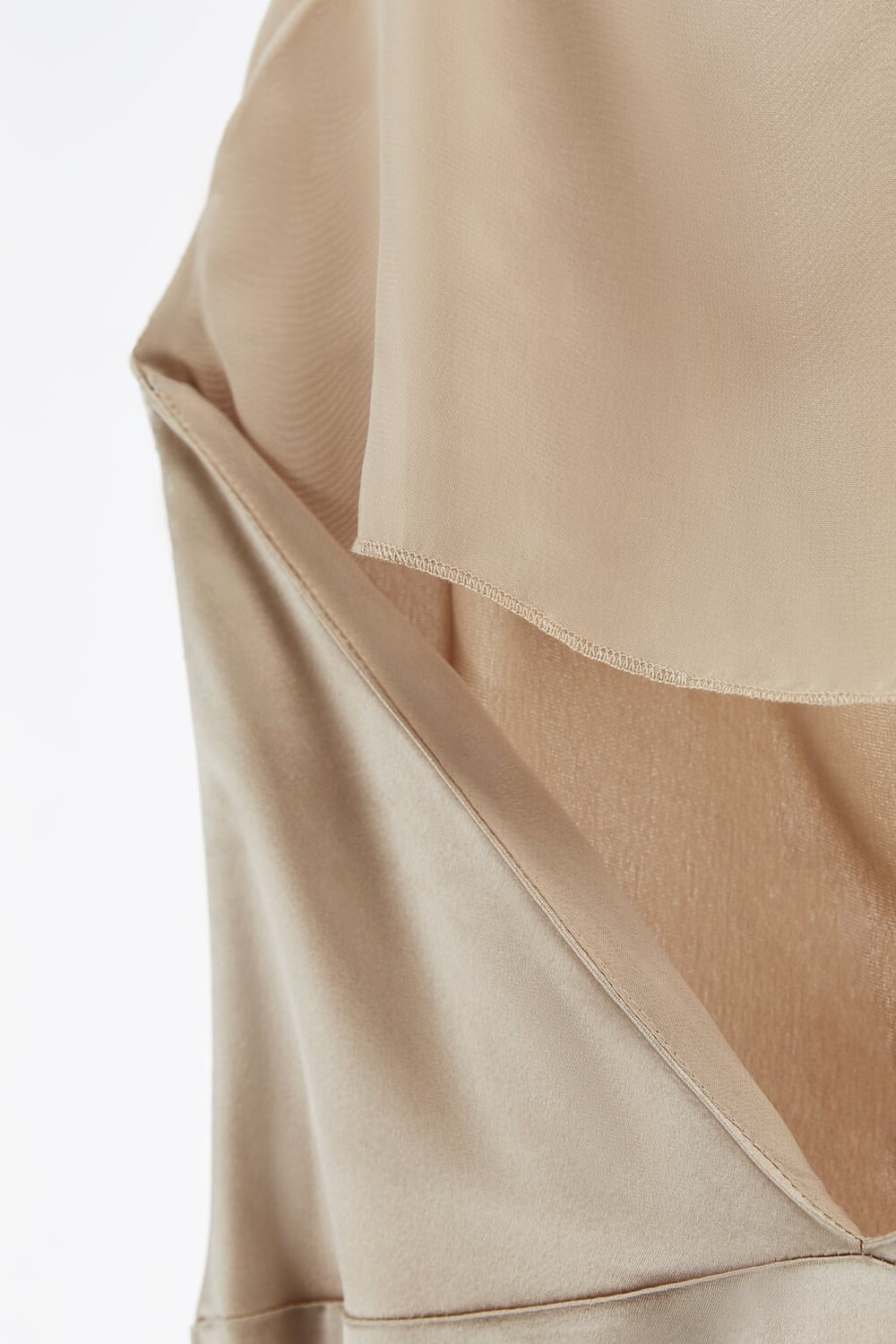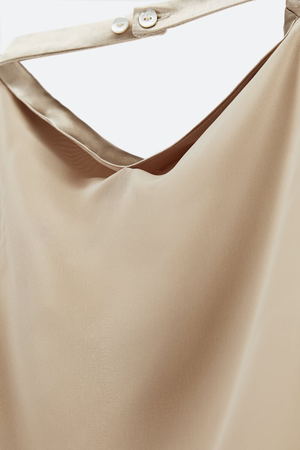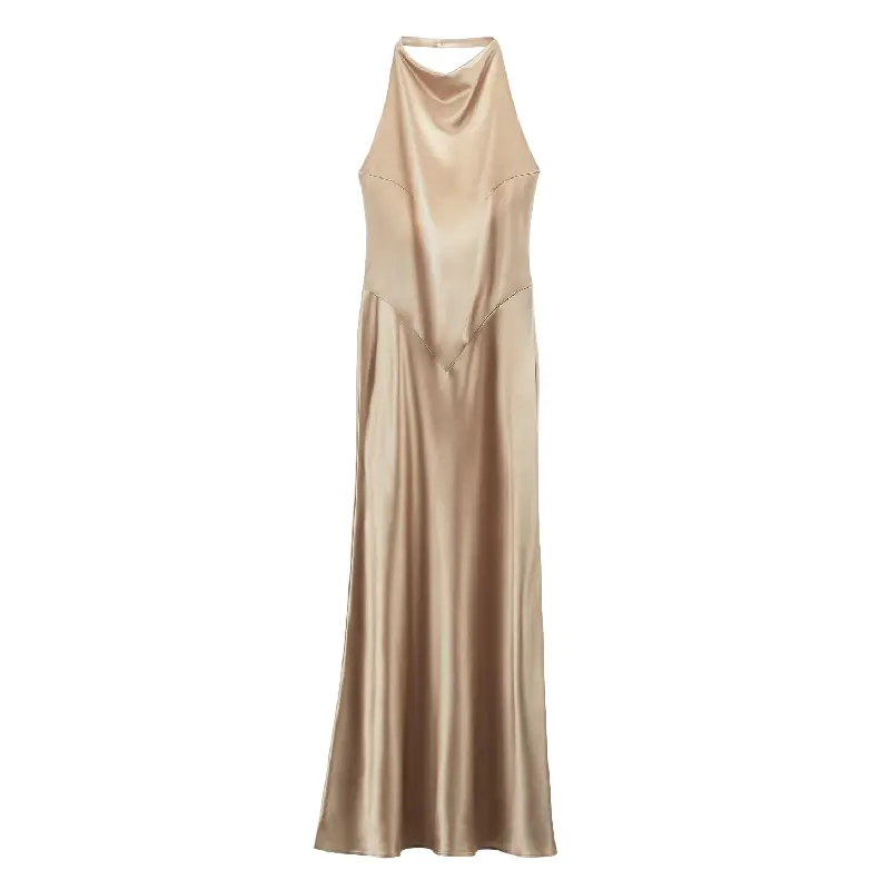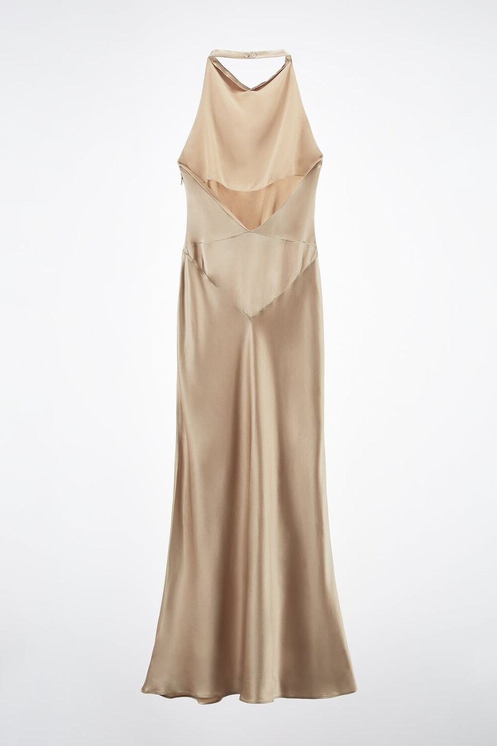 Длинное атласное платье с хомутом на шее. Расклешенный низ, потайная застежка на молнию сбоку и регулируемая застежка на пуговицы на шее.