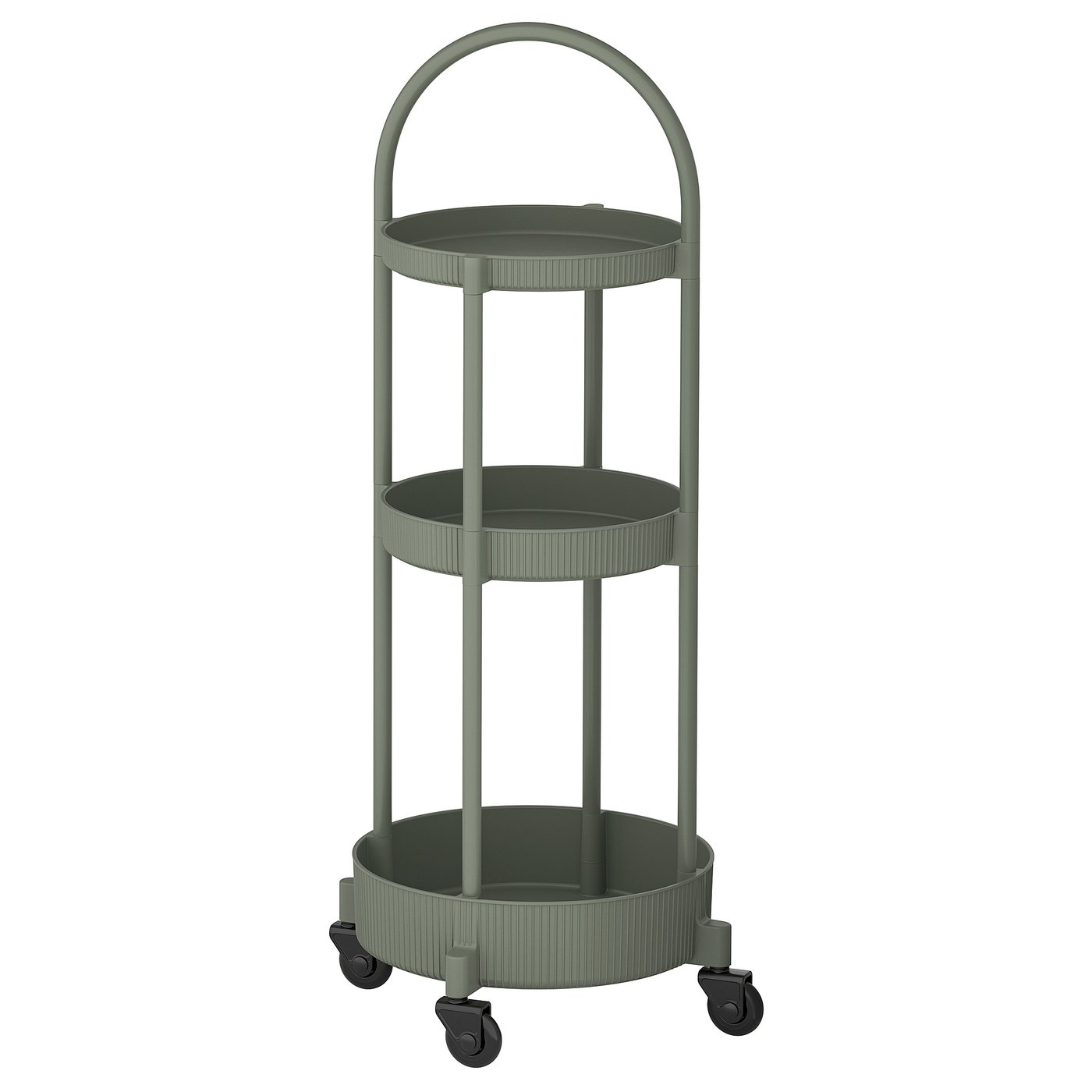 Круглая трехъярусная тележка для вечеринок в модном серо-зеленом цвете. Отлично смотрится как сама по себе, так и рядом с любимым креслом. Колесики и верхняя ручка позволяют легко перемещать ее туда, куда вам нужно.