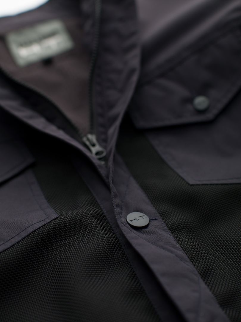 Куртка изготовлена из трехслойной нейлоновой и лайкровой сетки с кроем, напоминающим джинсовую куртку.