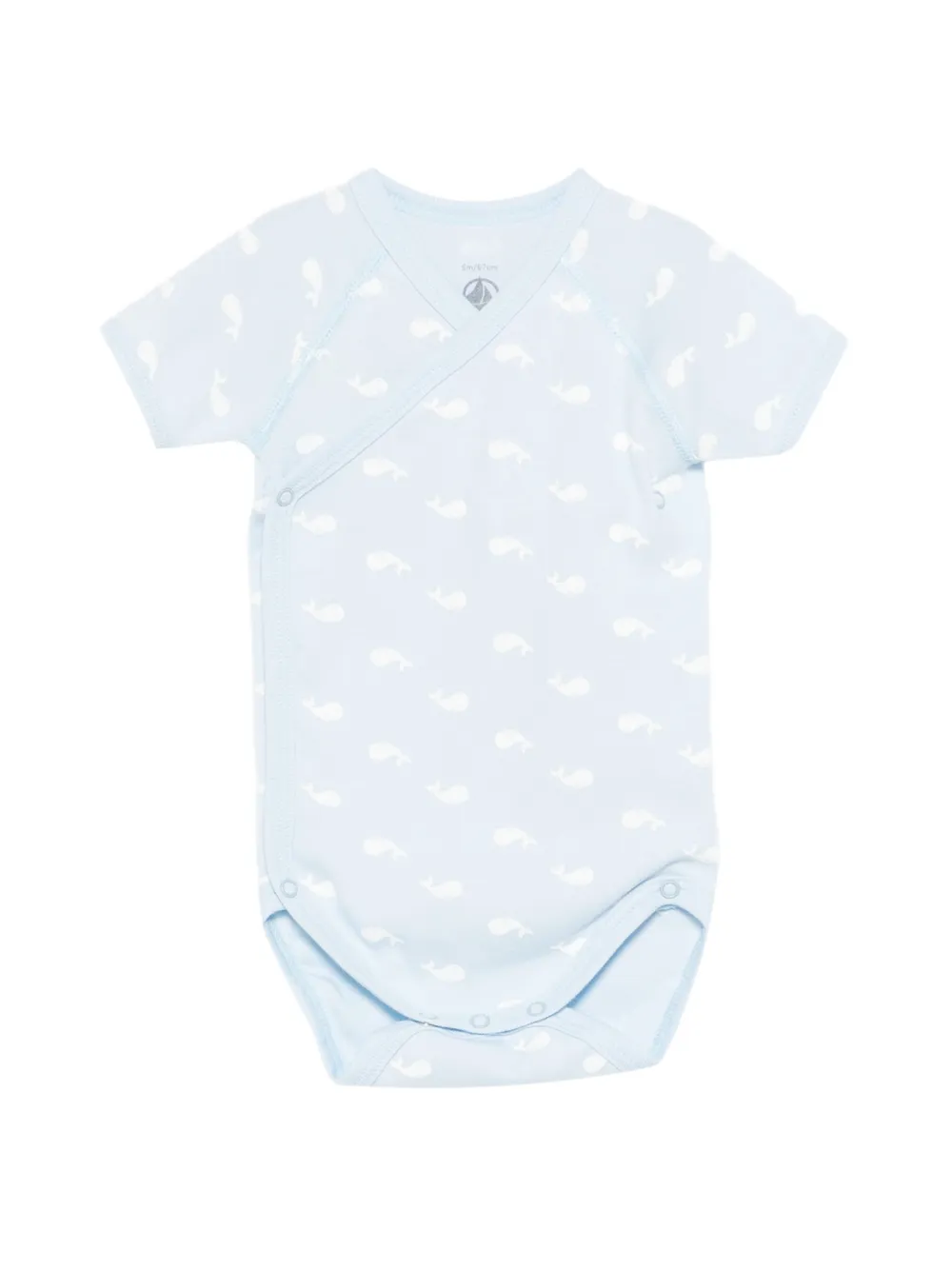 Синий и белый полосатый узор, короткие рукава, застежка на кнопки