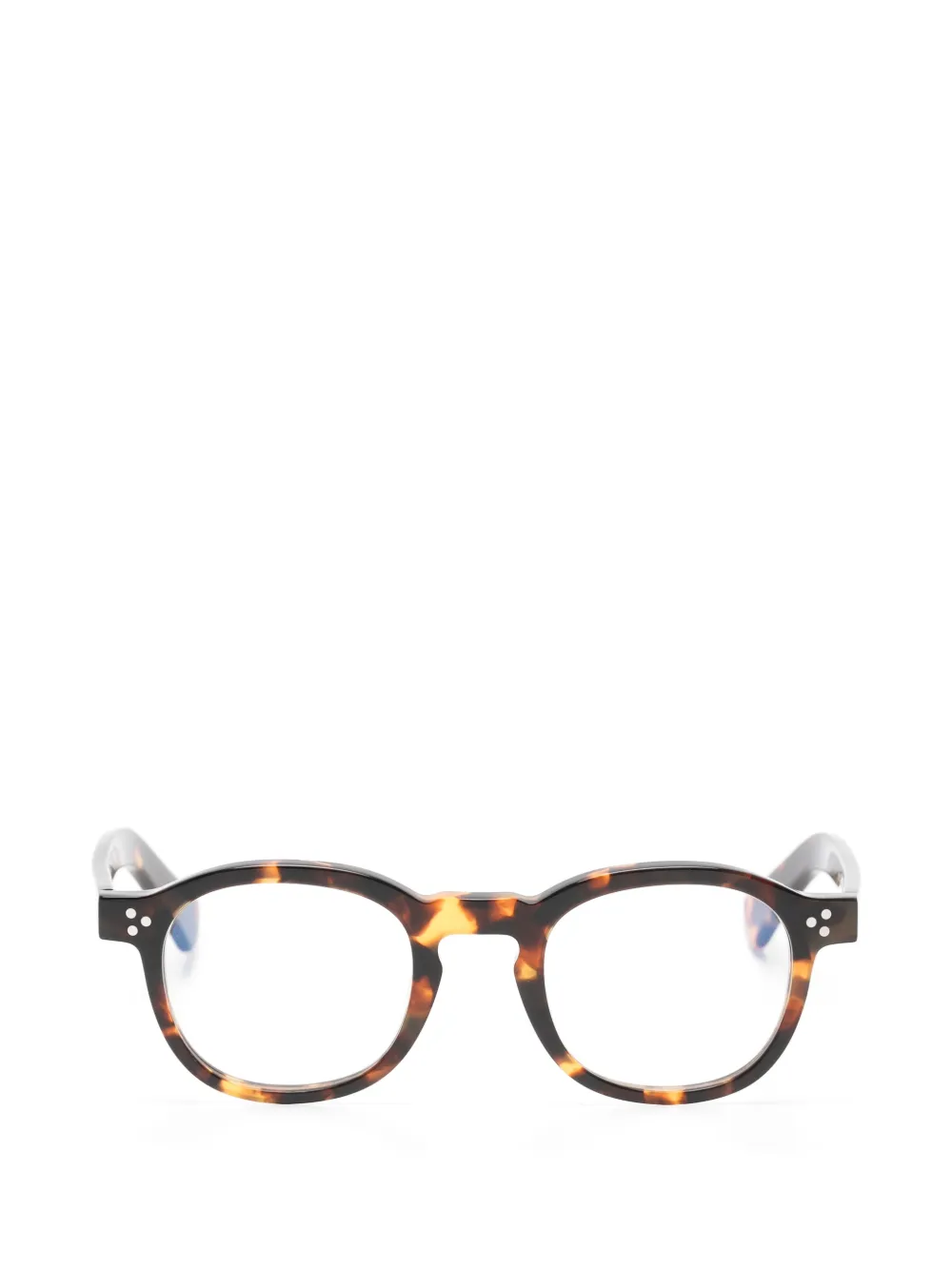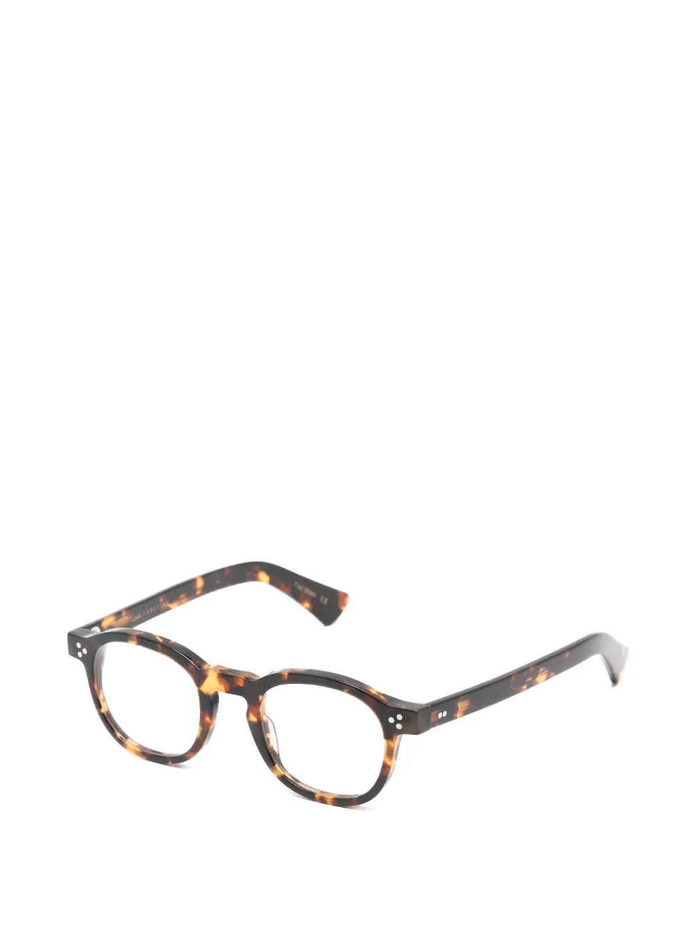 Коричневая оправа "под черепаху", круглая форма, заклепки, носовые упоры. Все очки продаются как оправа без диоптрий. К очкам прилагается защитный футляр.