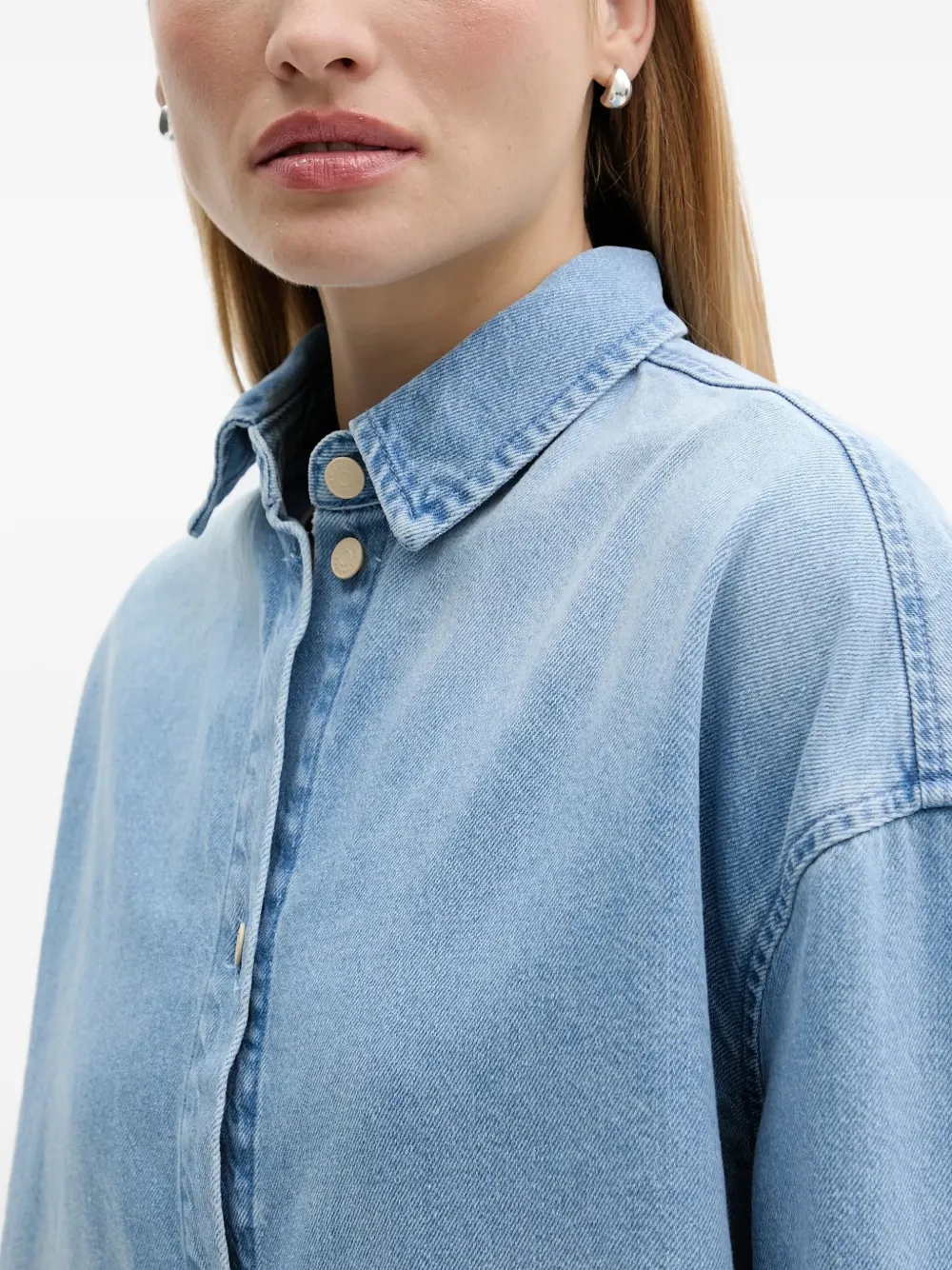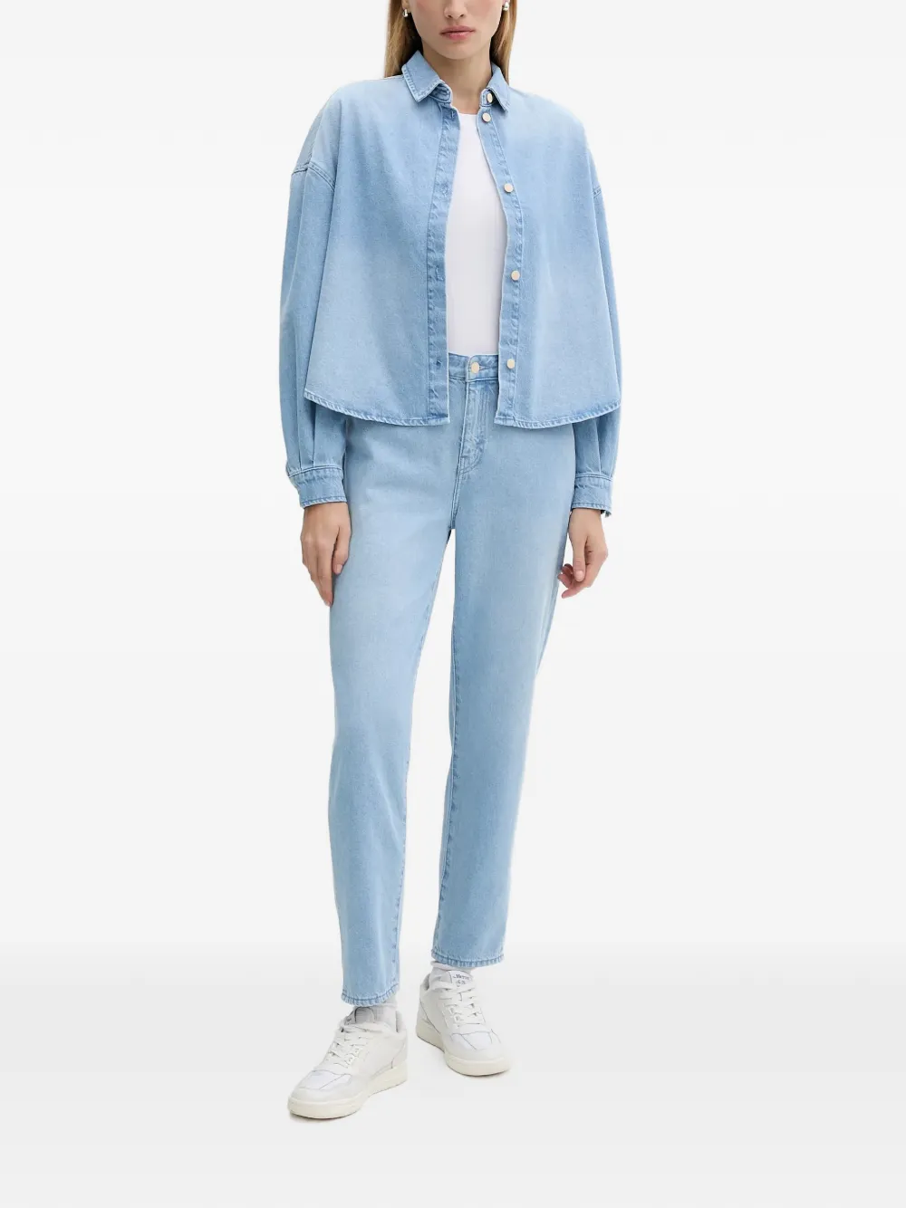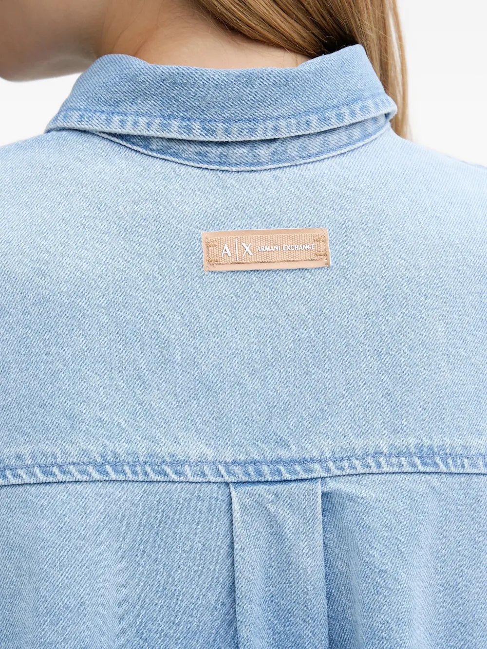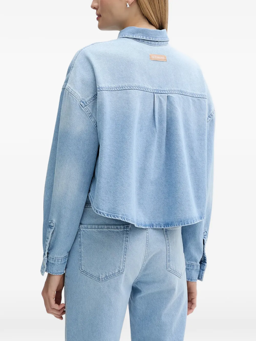 Светло-голубая укороченная рубашка свободного кроя с длинными рукавами, застежкой на пуговицы и логотипной нашивкой сзади