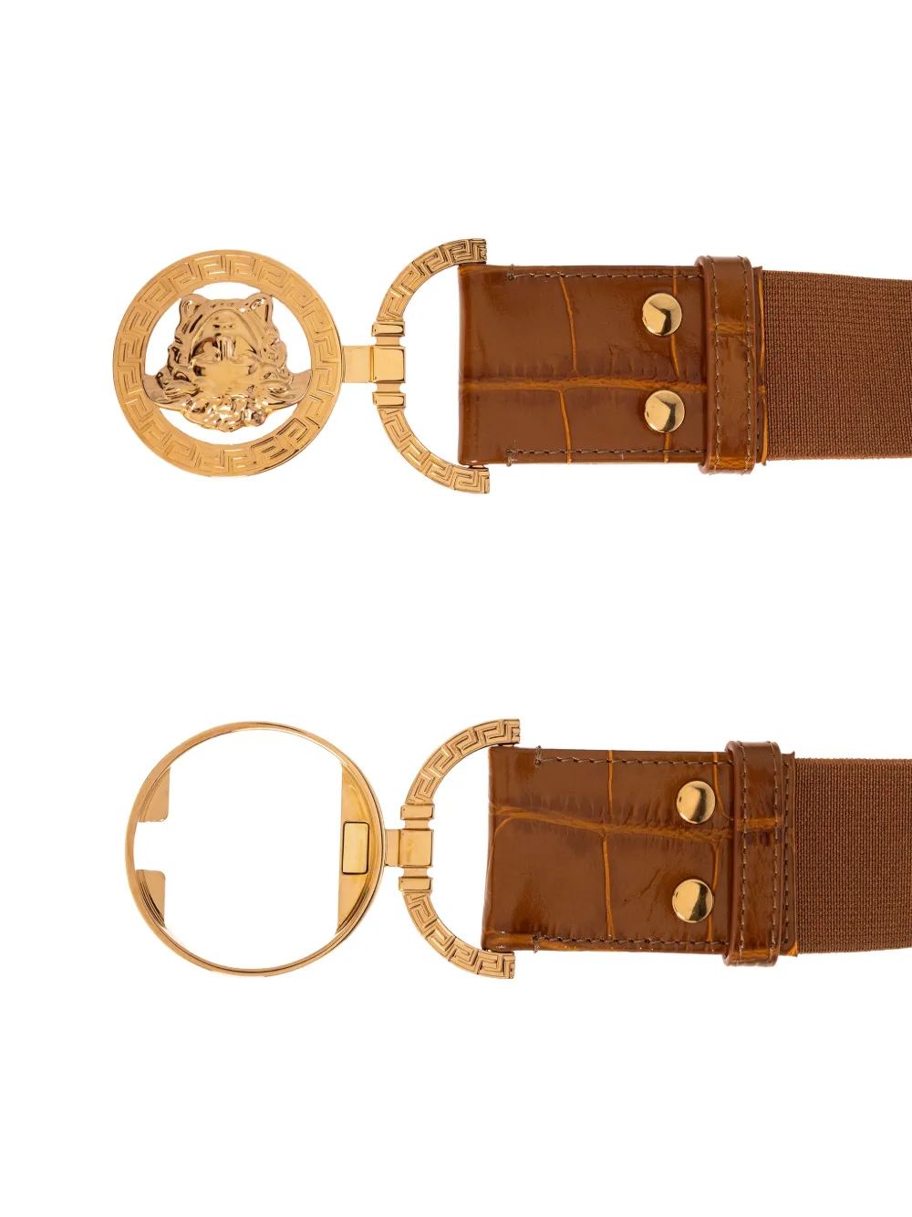 Коричневый цвет, фурнитура золотистого оттенка, тиснение под крокодила, фирменная бляшка с головой Медузы, регулируемая посадка