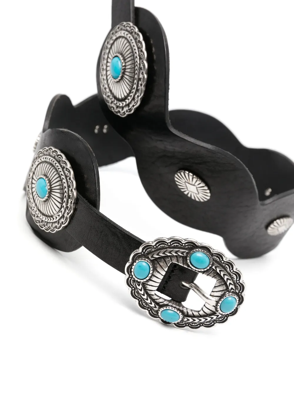 Черный, телячья кожа, серебристая фурнитура, гравировка, прорезанные отверстия, застежка с пряжкой спереди и регулируемый дизайн.