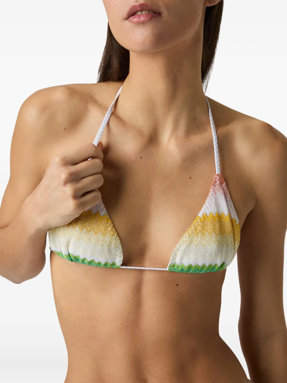 Белый и разноцветный комплект из двух предметов с зигзагообразным узором, шнуровкой и деталями, чашечки-треугольники, завязки; Полученный вами товар может немного отличаться от изображенного на фото. Это связано с индивидуальным ручным изготовлением всех изделий Missoni.
