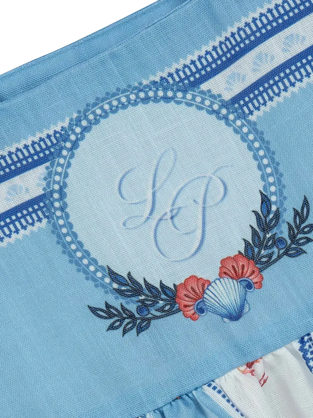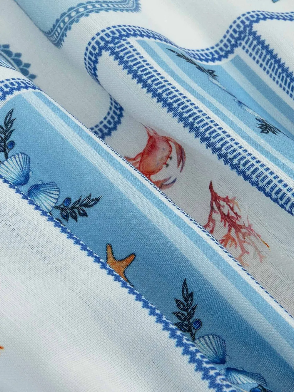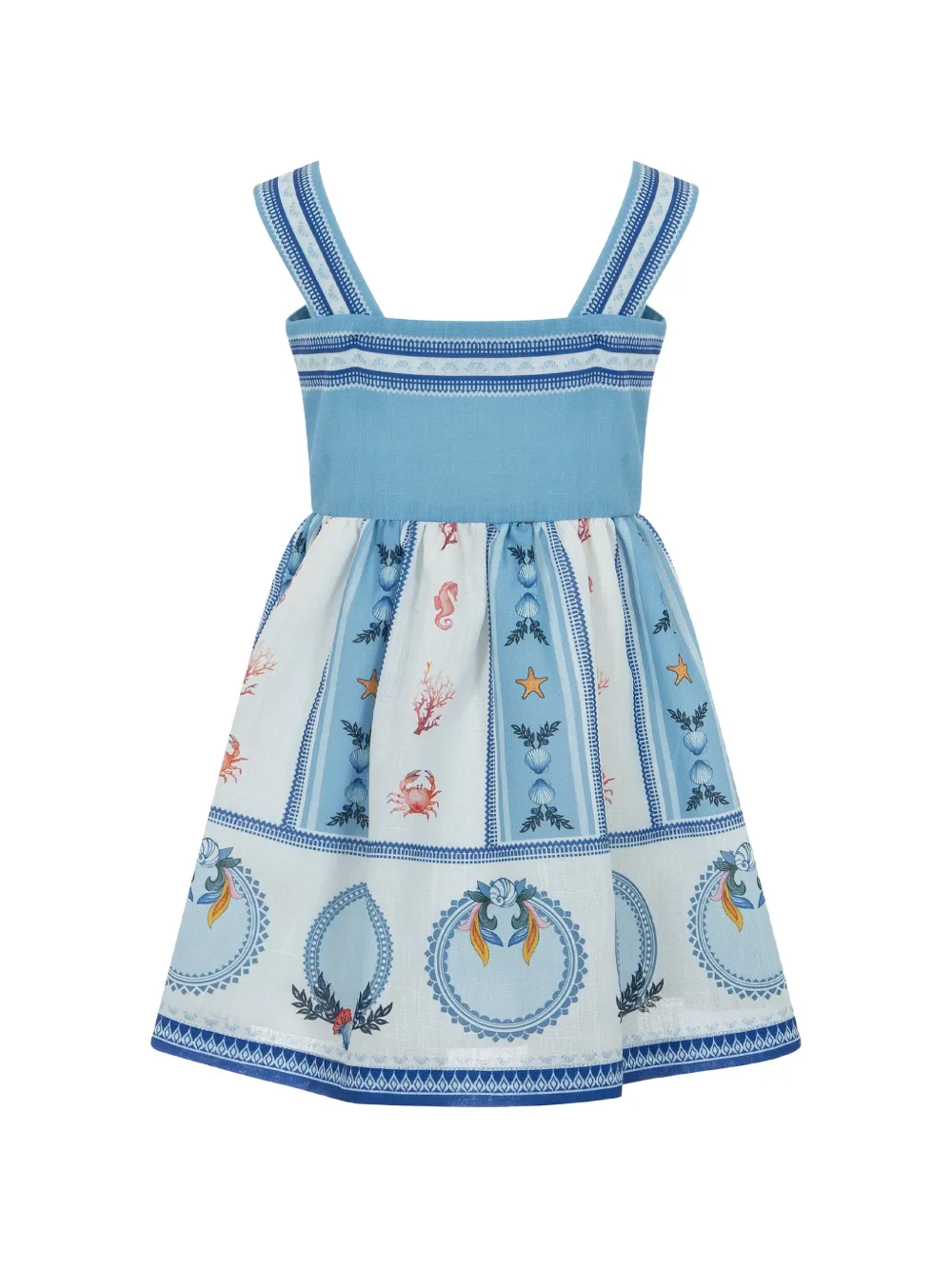 Синяя юбка с морским принтом, вышитым мотивом, лямками, декоративными швами и расклешенным кроем