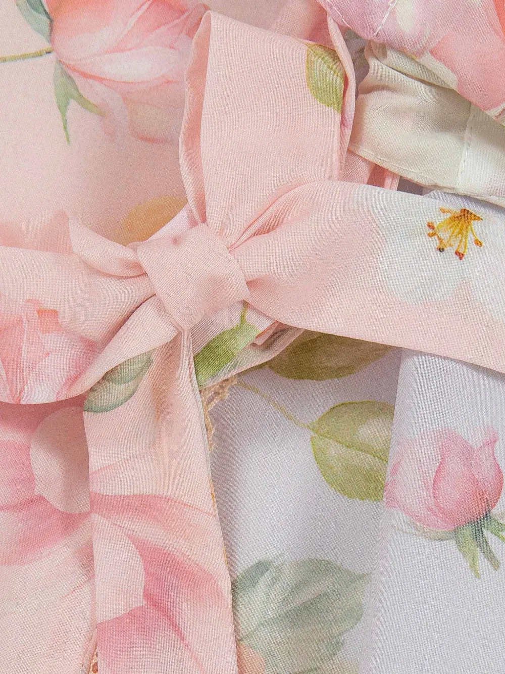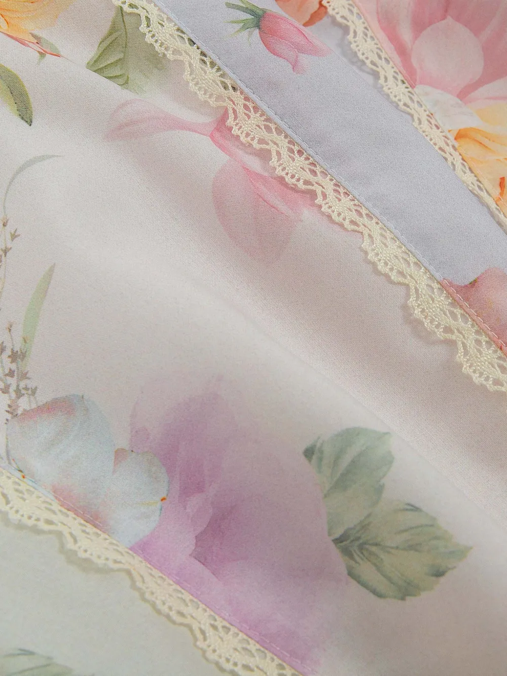 Розовая и разноцветная с цветочным принтом, кружевной отделкой, завязками на плечах, оборчатым подолом, без рукавов, с панельной конструкцией