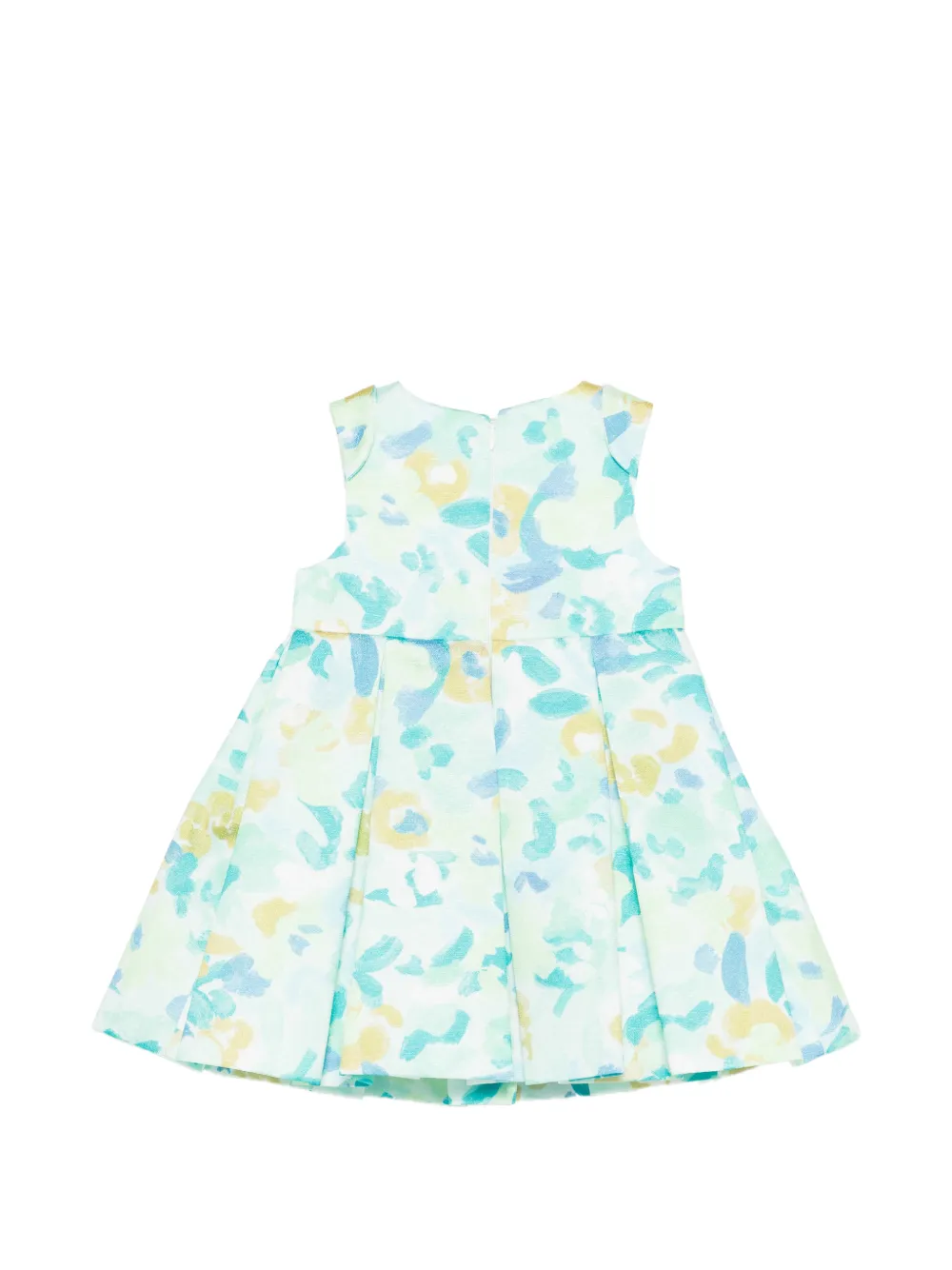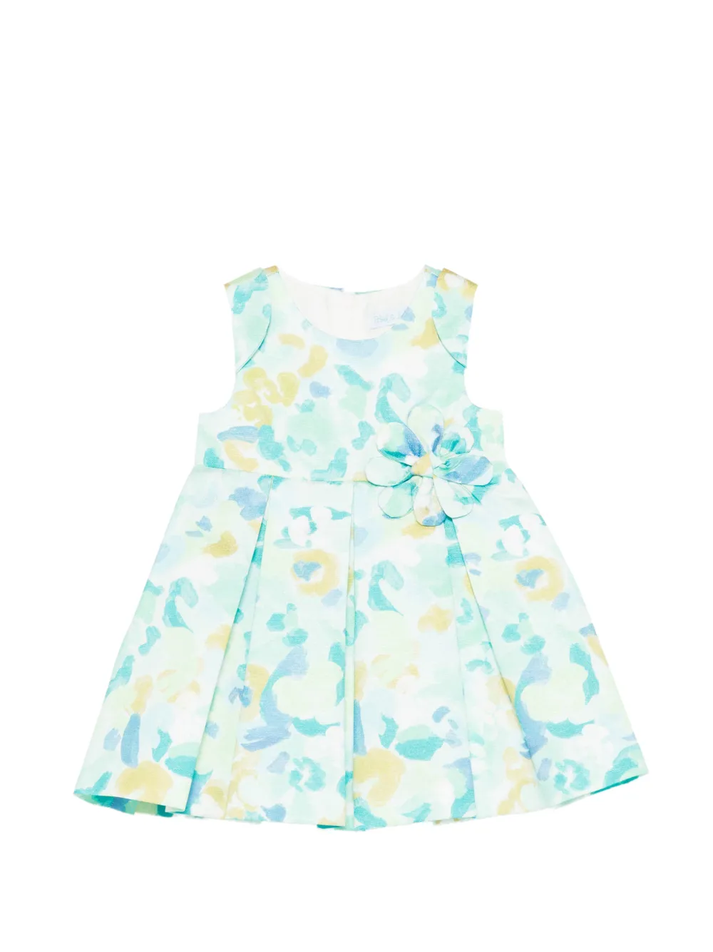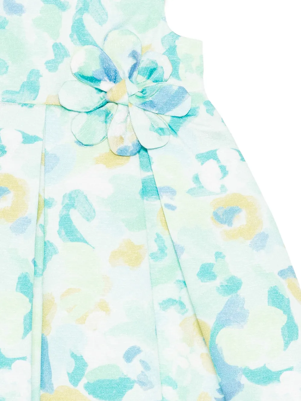 Нежно-зеленое платье без рукавов с цветочным принтом, круглым вырезом, плиссировкой и декоративным цветком