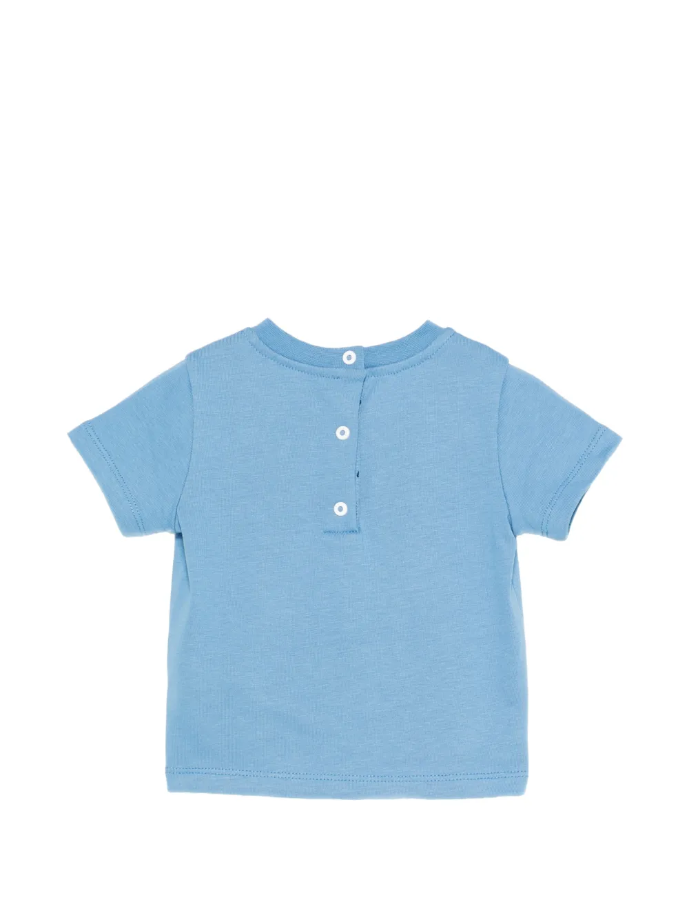 Синий цвет, принт с логотипом, круглый вырез, короткие рукава, застежка на кнопках