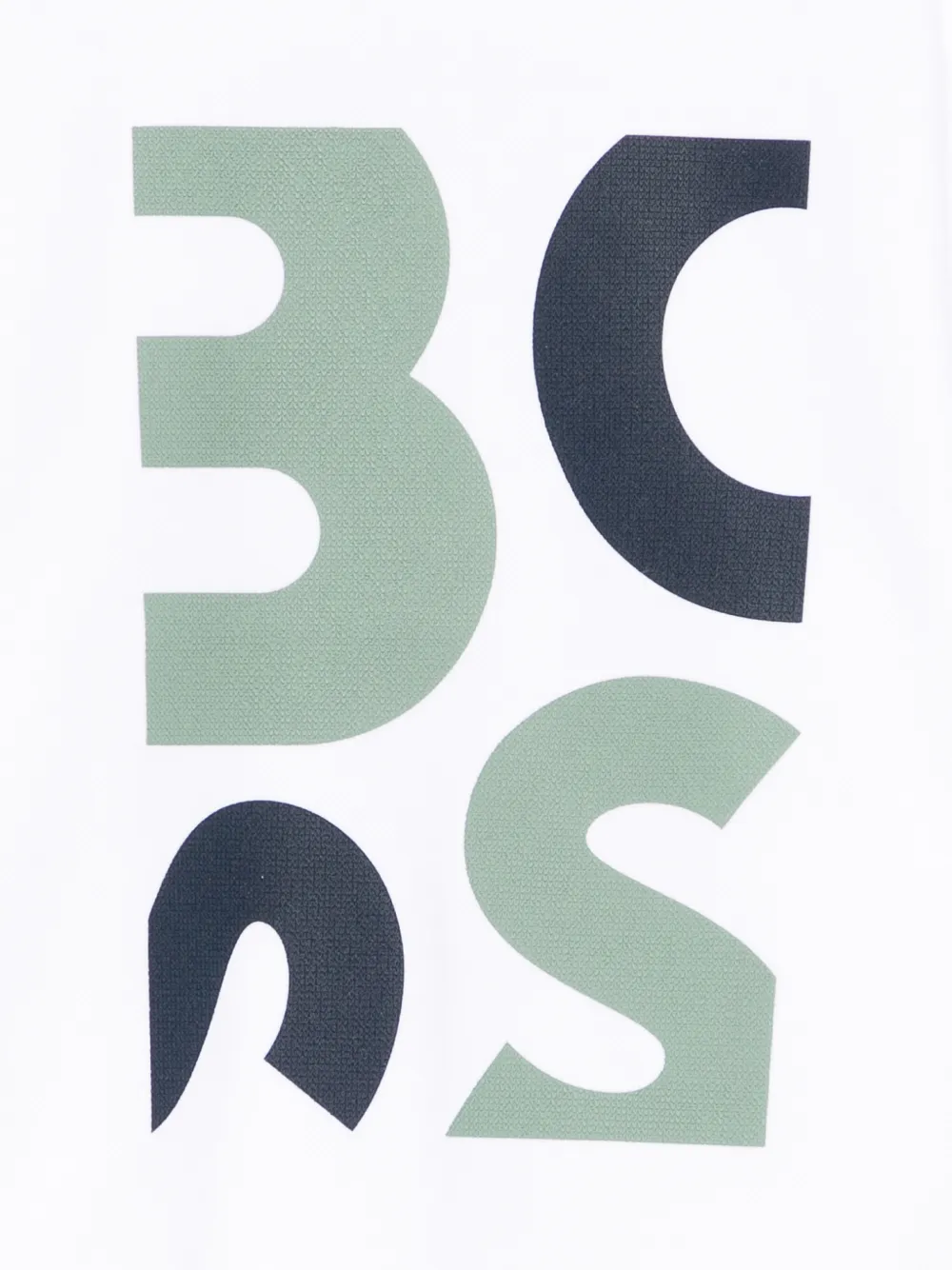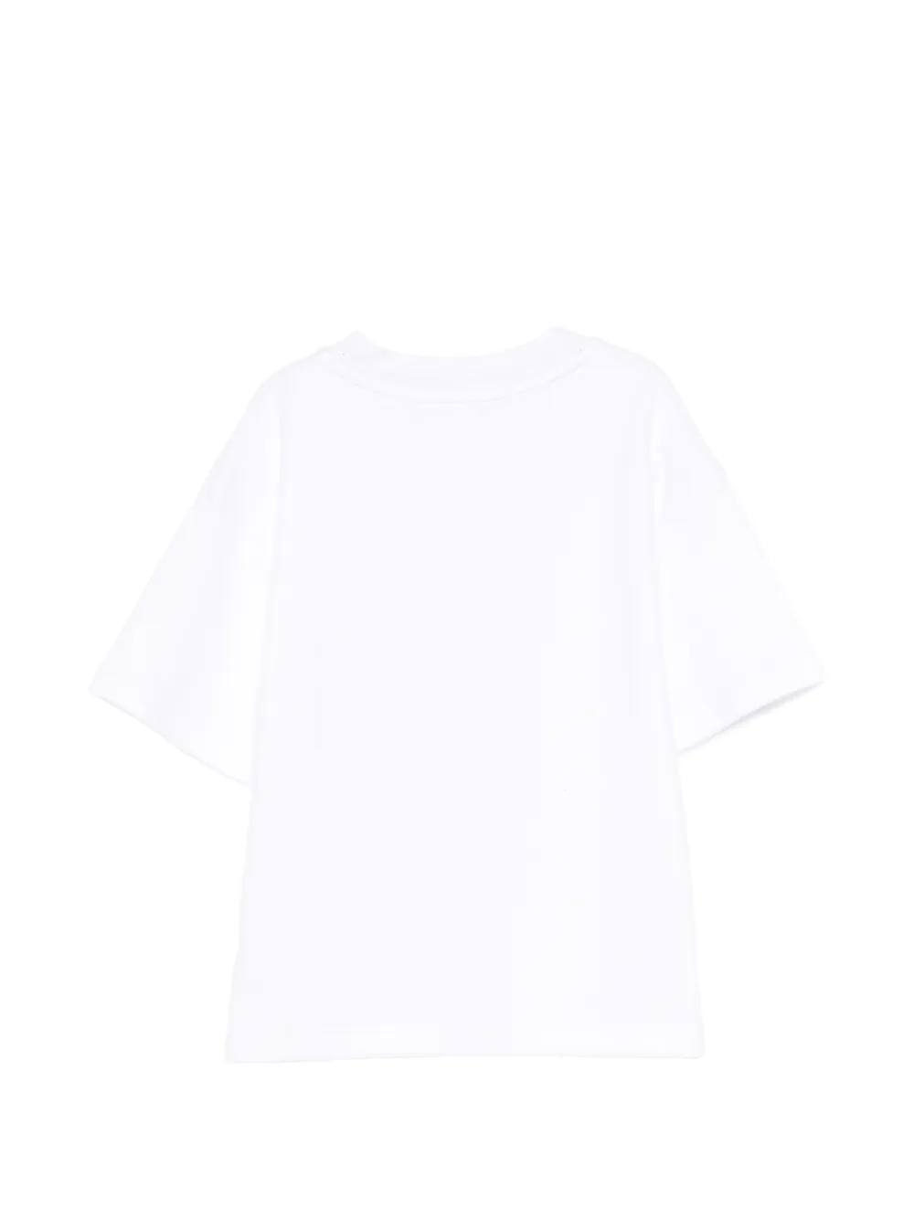 Белая футболка с графическим принтом, круглым вырезом, короткими рукавами и прямым подолом