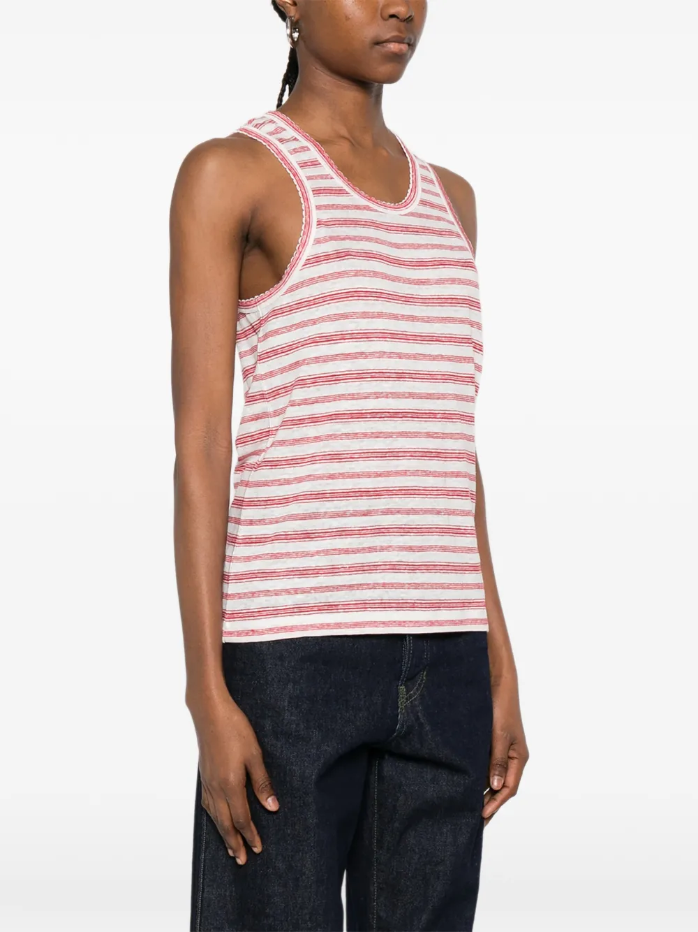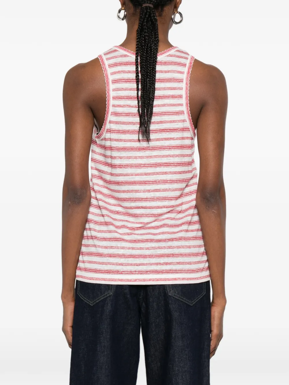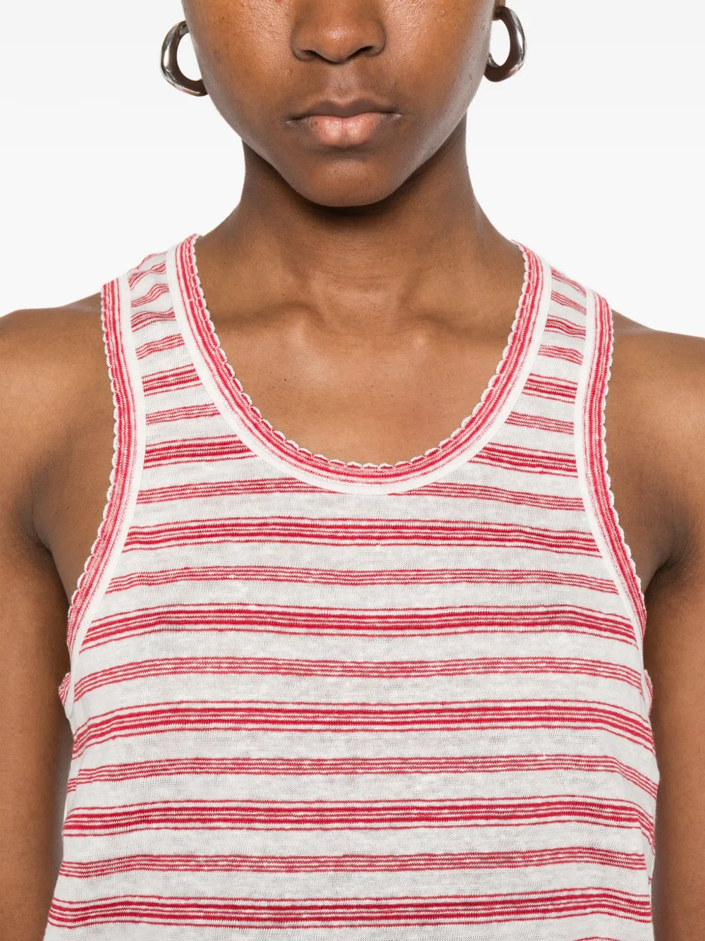Красно-белая полосатая майка с круглым вырезом, без рукавов, с необработанными краями и прямым подолом