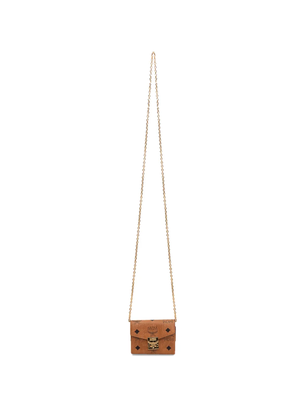 Коньячный цвет, принт-лого по всему изделию, фурнитура золотистого оттенка, плечевой ремень-цепочка, верх с клапаном, застежка-защелка