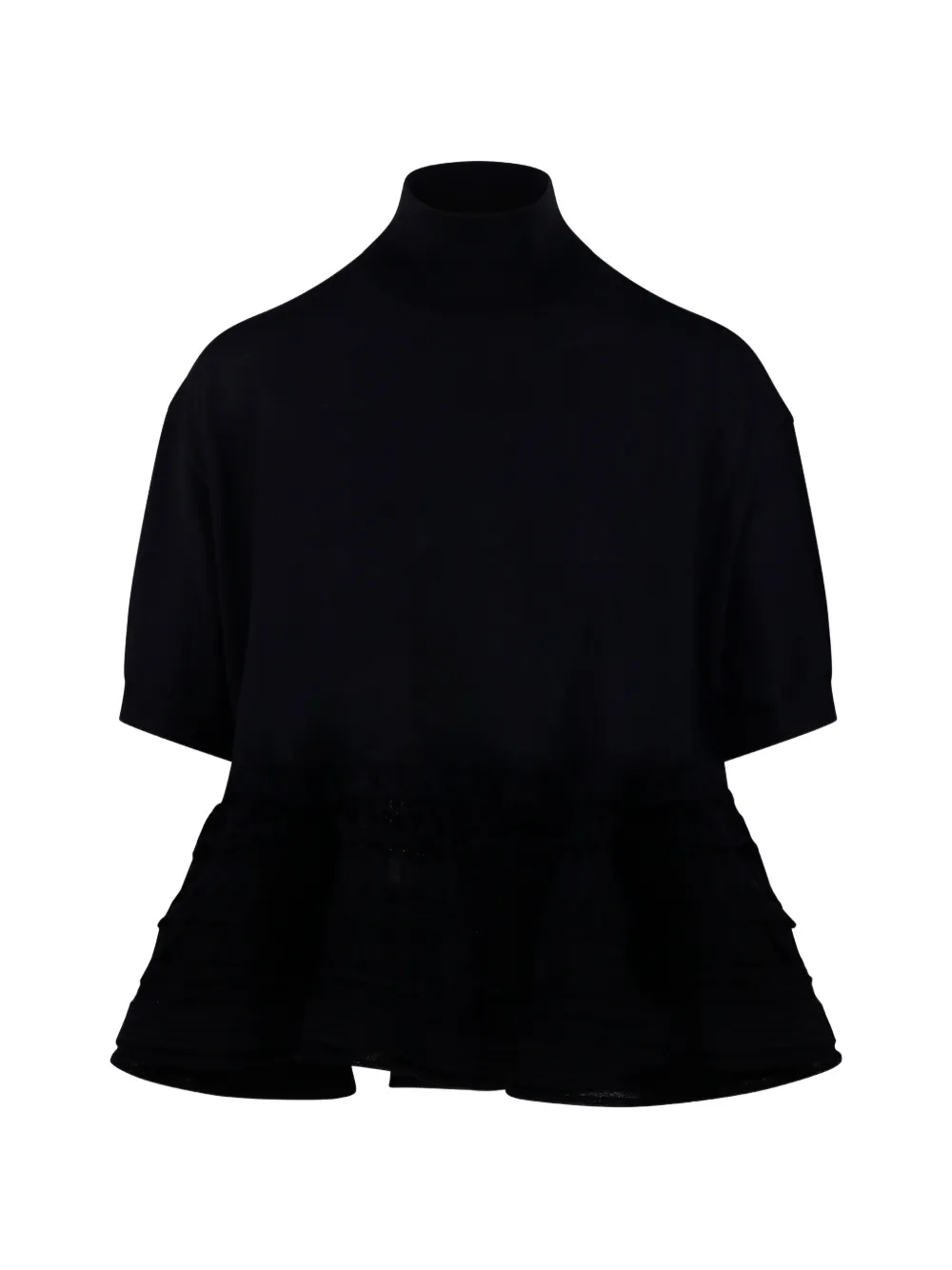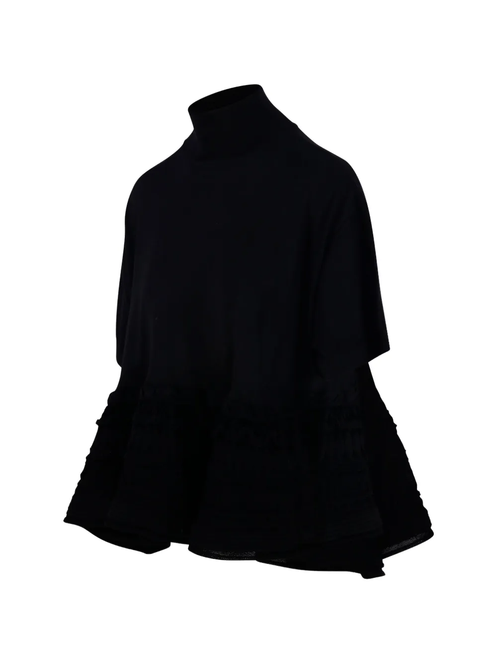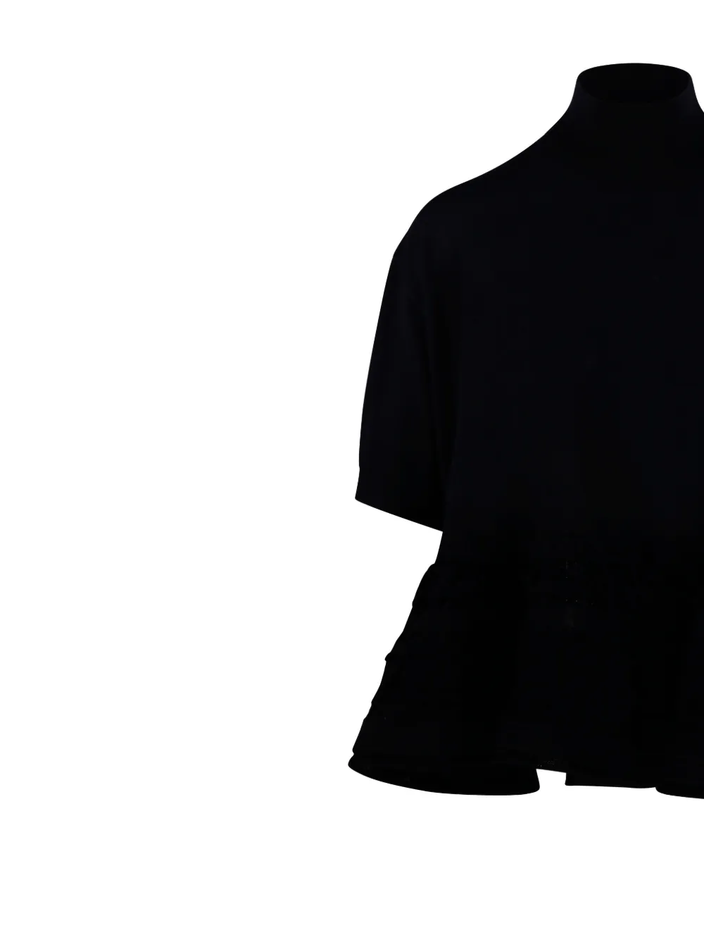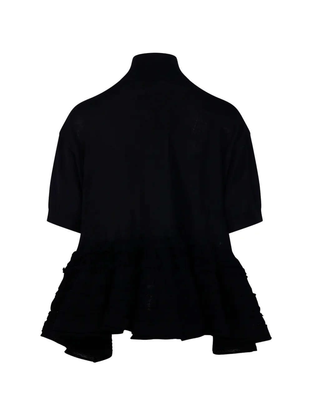 Черный топ с высоким воротником, короткими рукавами, ярусной оборкой, полупрозрачными вставками и свободным кроем
