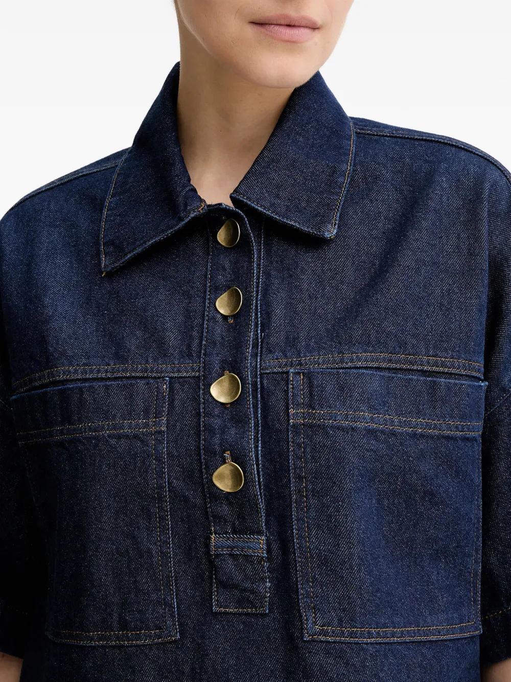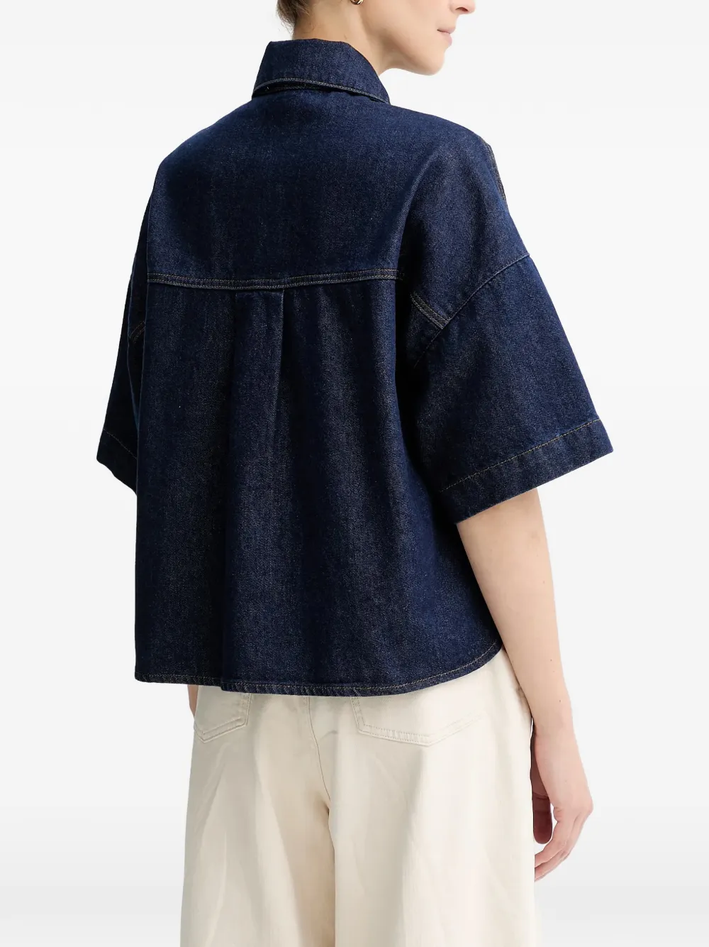 Синий цвет, воротник с острыми концами, застежка на пуговицы спереди, короткие рукава, накладные карманы на груди, кокетка на спине